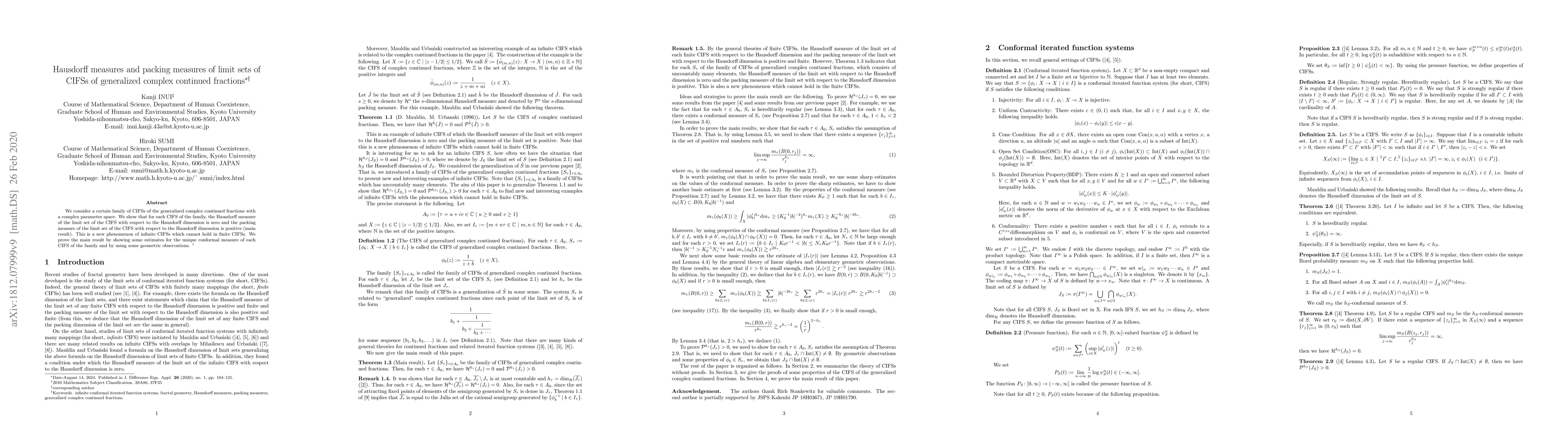 We consider a family of CIFSs of the generalized complex continued fractions with a complex parameter space. We show that for each CIFS of the family, the Hausdorff measure of the limit set of the CIFS with respect to the Hausdorff dimen/sion is zero and the packing measure of the limit set of the CIFS with respect to the Hausdorff dimension is positive (main result). This is a new phenomenon of infinite CIFSs which cannot hold in finite CIFSs. We prove the main result by showing some estimates for the unique conformal measure of each CIFS of the family and by using some geometric observations.