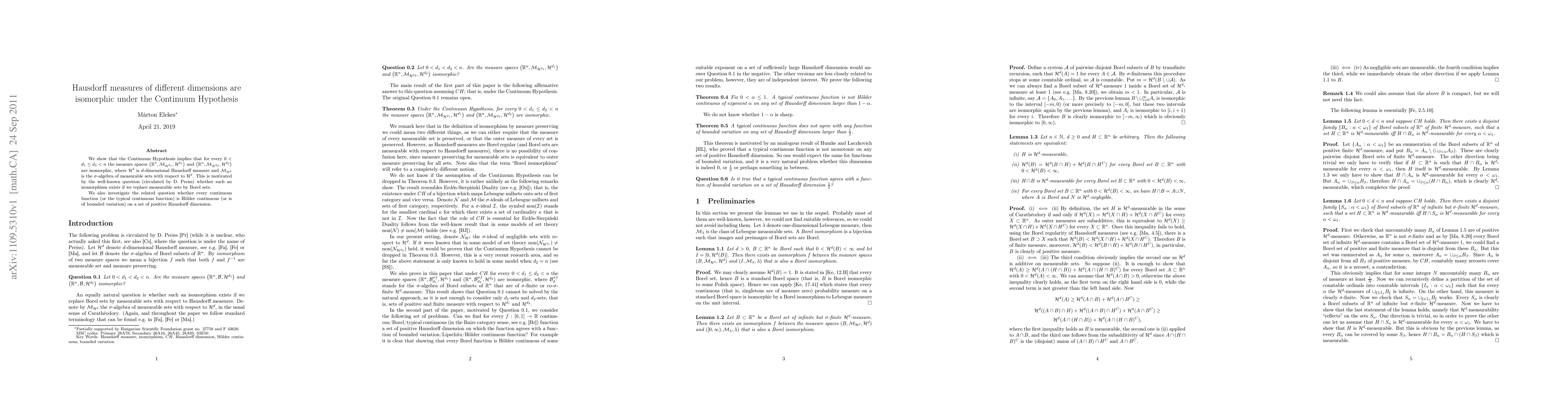 Under the Continuum Hypothesis, the paper proves that Hausdorff measures of different intermediate dimensions within Euclidean space are isomorphic. This also touches upon the question of whether continuous functions exhibit specific continuity properties on sets of positive Hausdorff dimension.