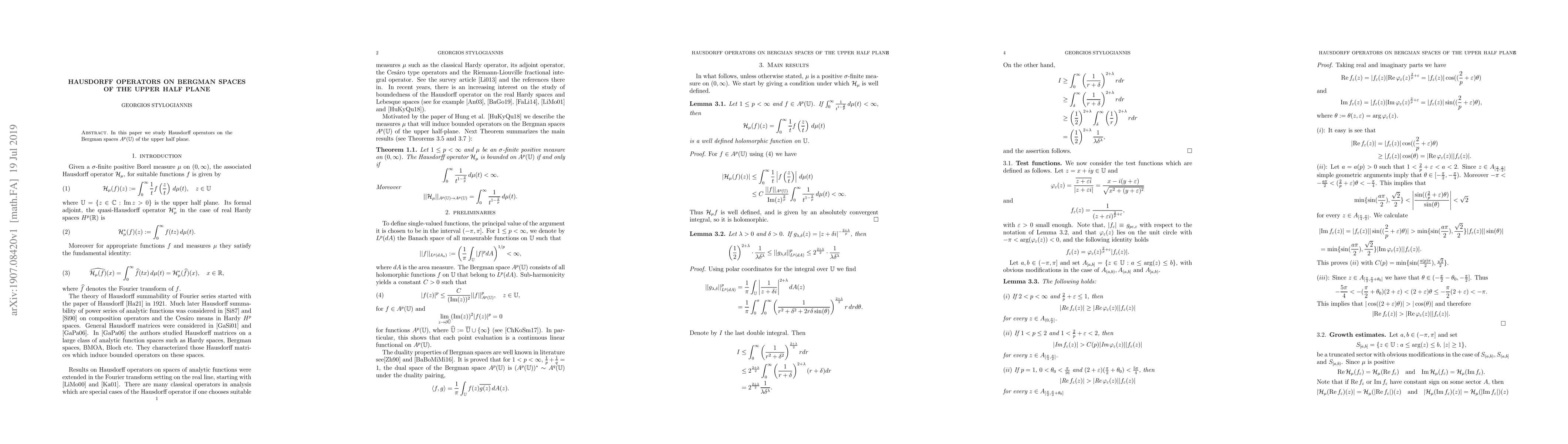 Summary: This paper investigates Hausdorff operators acting on the Bergman spaces $A^{p}(\mathbb{U})$ of the upper half plane, focusing on their properties and effects within this specific functional space.