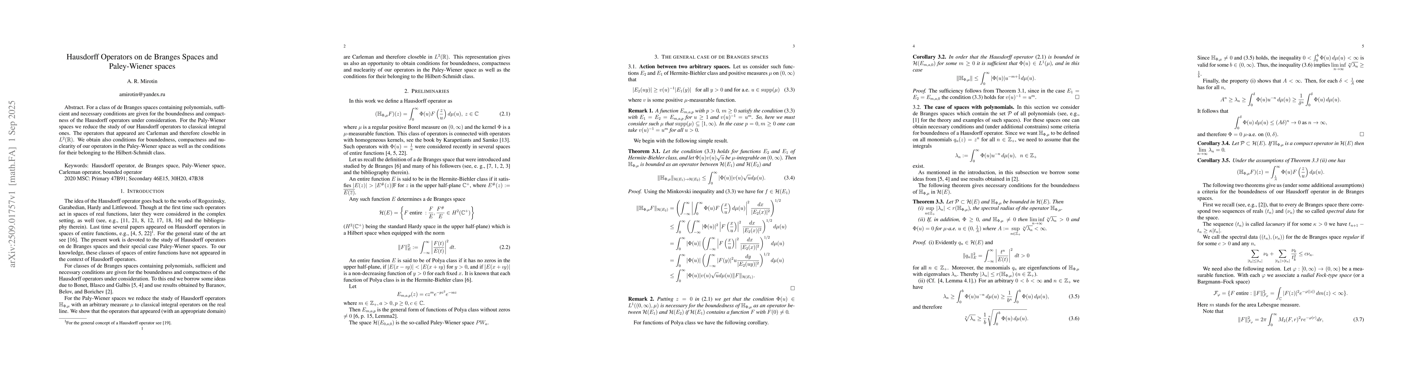 For a class of de Branges spaces containing polynomials, sufficient and necessary conditions are given for the boundedness and compactness of the Hausdorff operators under consideration. For the Paly-Wiener spaces we reduce the study of our Hausdorff operators to classical integral ones. The operators that appeared are Carleman and therefore closeble in $L^2(\mathbb{R})$. We obtain also conditions for boundedness, compactness and nuclearity of our operators in the Paley-Wiener space as well as the conditions for their belonging to the Hilbert-Schmidt class.