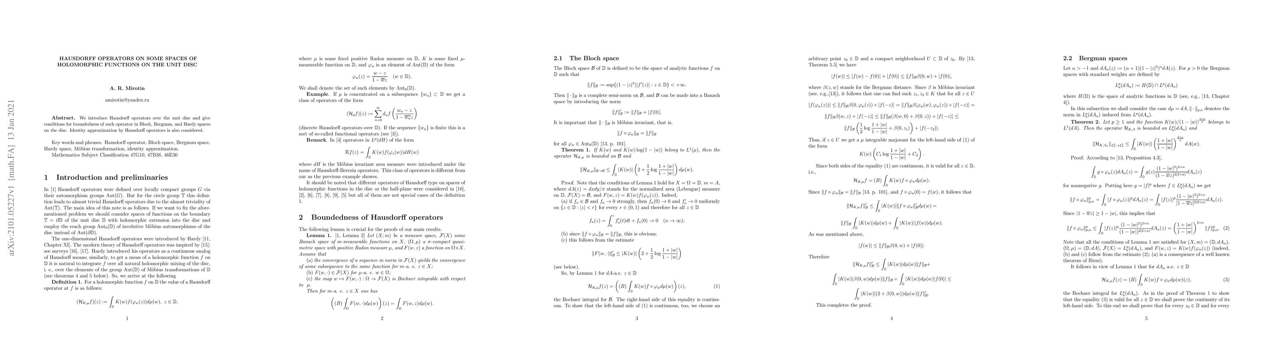 We introduce Hausdorff operators over the unit disc and give conditions for boundedness of such operator in Bloch, Bergman, and Hardy spaces on the disc. Identity approximation by Hausdorff operators is also considered.