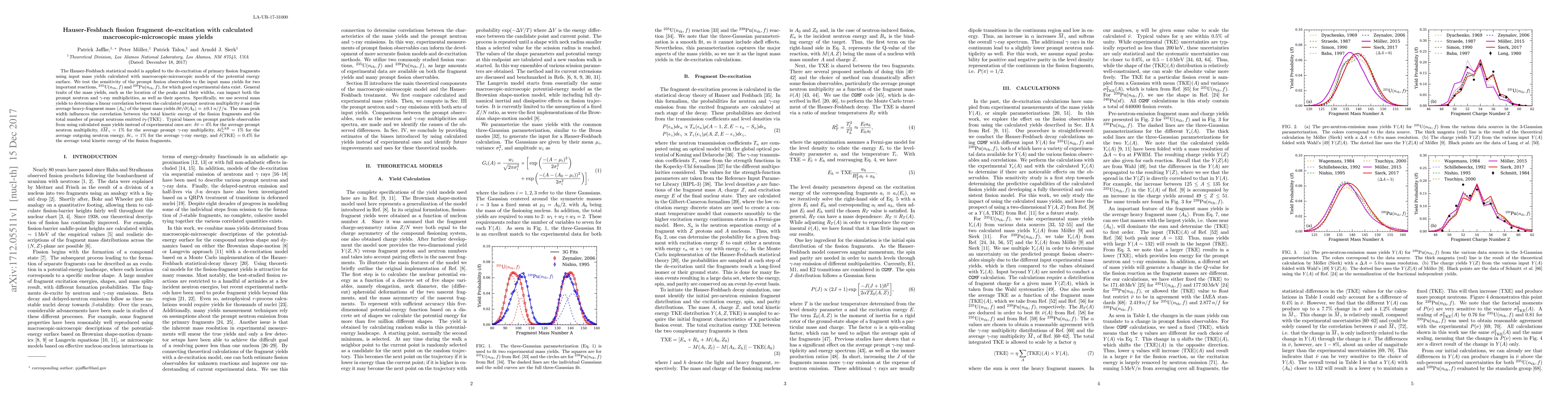This paper applies the Hauser-Feshbach model to study the de-excitation of fission fragments, using macroscopic-microscopic mass yields. It finds that mass yield traits affect prompt neutron and gamma-ray observables, with a linear correlation between prompt neutron multiplicity and heavy-fragment mass.