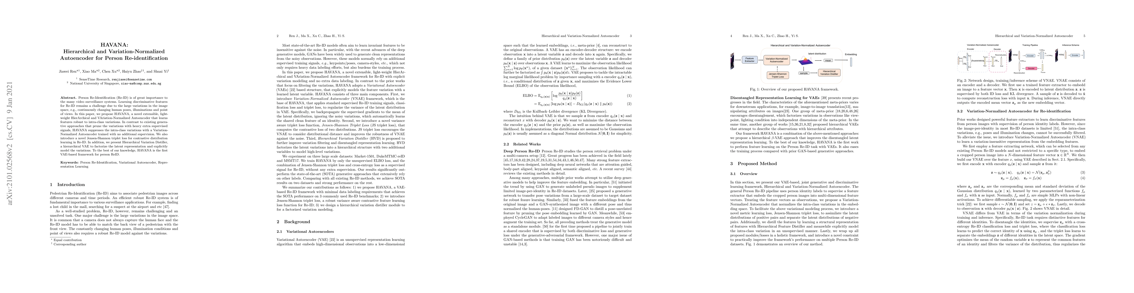 HAVANA is a novel hierarchical and variation-normalized autoencoder for person re-identification, designed to learn robust features despite intra-class variations. It employs a Variation-Normalized Autoencoder and a hierarchical VAE to model variations without additional supervision, enhancing discriminative feature learning for video surveillance systems.