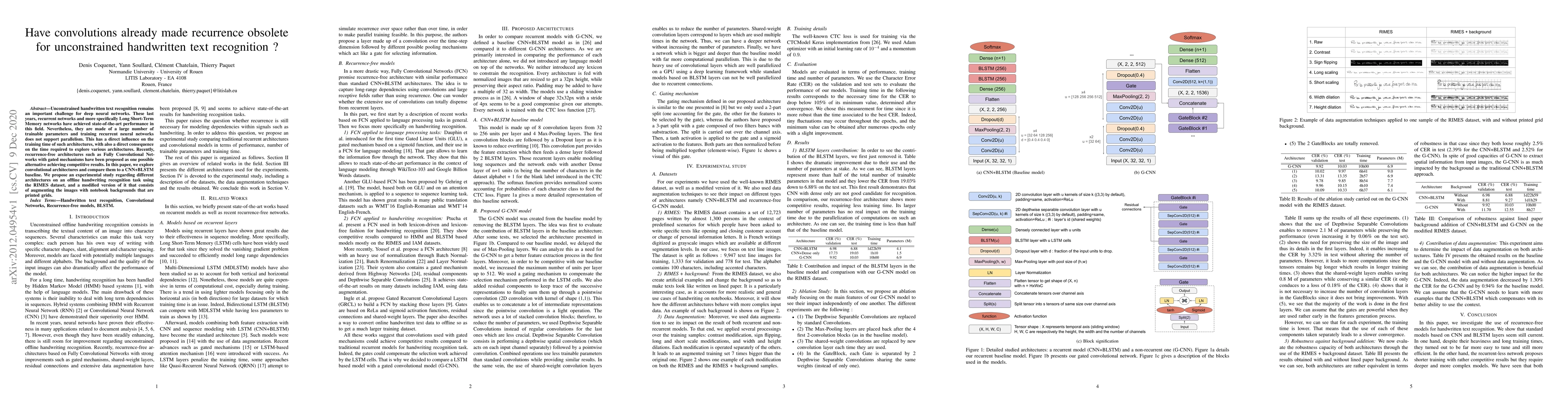 This paper investigates whether convolutional architectures can outperform recurrent networks, specifically Long Short-Term Memory networks, in unconstrained handwritten text recognition. The study compares convolutional networks with gated mechanisms against a CNN+BLSTM baseline on the RIMES dataset and its augmented version.