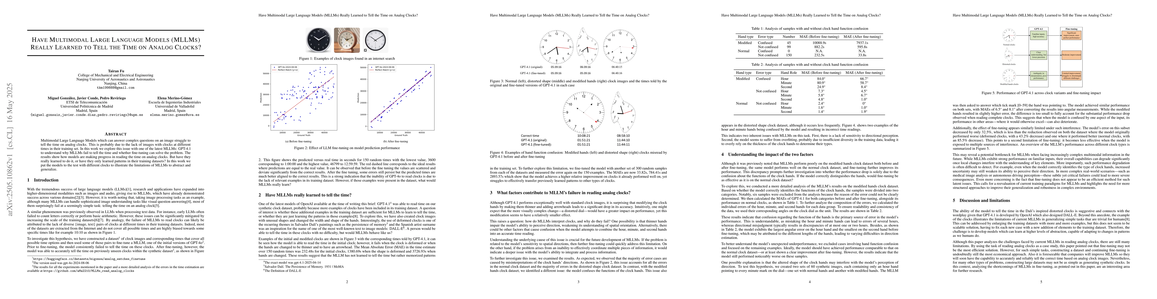 Multimodal Large Language Models which can answer complex questions on an image struggle to tell the time on analog clocks. This is probably due to the lack of images with clocks at different times in their training set. In this work we explore this issue with one of the latest MLLMs: GPT-4.1 to understand why MLLMs fail to tell the time and whether fine-tuning can solve the problem. The results show how models are making progress in reading the time on analog clocks. But have they really learned to do it, or have they only learned patterns in their training datasets? In this work we put the models to the test with different clocks to illustrate the limitations of MLLMs to abstract and generalize.