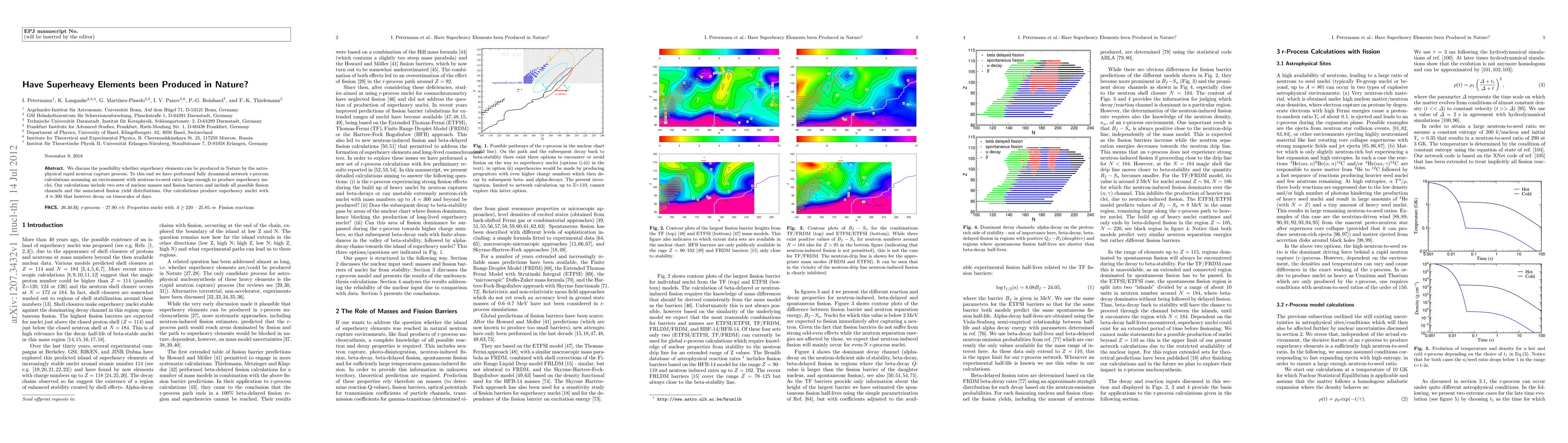 We discuss the possibility whether superheavy elements can be produced in Nature by the astrophysical rapid neutron capture process. To this end we have performed fully dynamical network r-process calculations assuming an environment with neutron-to-seed ratio large enough to produce superheavy nuclei. Our calculations include two sets of nuclear masses and fission barriers and include all possible fission channels and the associated fission yield distributions. Our calculations produce superheavy nuclei with A ~ 300 that however decay on timescales of days.