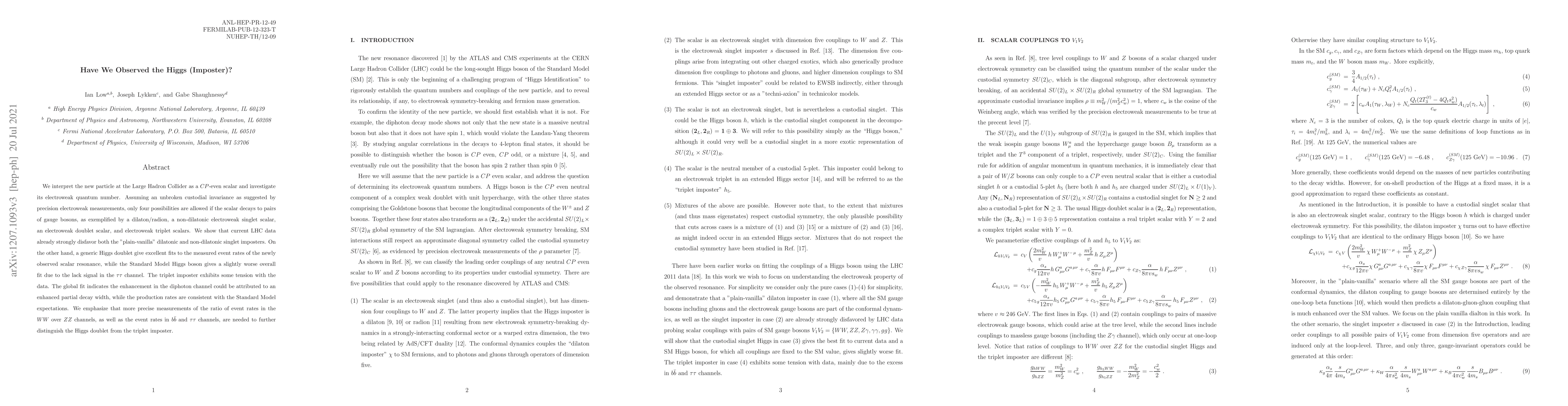 We interpret the new particle at the Large Hadron Collider as a CP-even scalar and investigate its electroweak quantum number. Assuming an unbroken custodial invariance as suggested by precision electroweak measurements, only four possibilities are allowed if the scalar decays to pairs of gauge bosons, as exemplified by a dilaton/radion, a non-dilatonic electroweak singlet scalar, an electroweak doublet scalar, and electroweak triplet scalars. We show that current LHC data already strongly disfavor both the dilatonic and non-dilatonic singlet imposters. On the other hand, a generic Higgs doublet give excellent fits to the measured event rates of the newly observed scalar resonance, while the Standard Model Higgs boson gives a slightly worse overall fit due to the lack signal in the tau tau channel. The triplet imposter exhibits some tension with the data. The global fit indicates the enhancement in the diphoton channel could be attributed to an enhanced partial decay width, while the production rates are consistent with the Standard Model expectations. We emphasize that more precise measurements of the ratio of event rates in the WW over ZZ channels, as well as the event rates in b bbar and tau tau channels, are needed to further distinguish the Higgs doublet from the triplet imposter.
