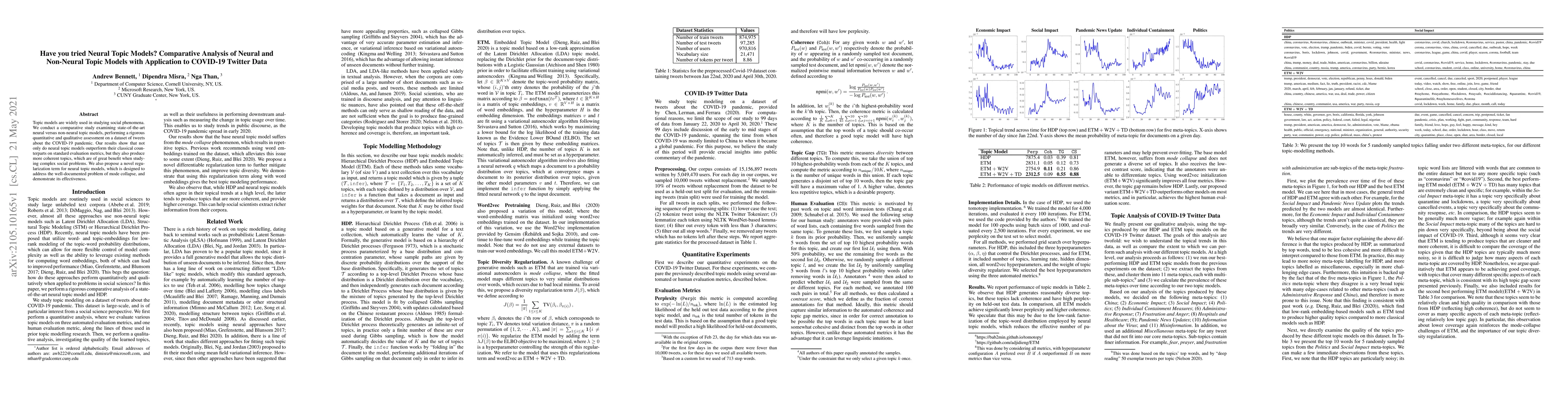 Topic models are widely used in studying social phenomena. We conduct a comparative study examining state-of-the-art neural versus non-neural topic models, performing a rigorous quantitative and qualitative assessment on a dataset of tweets about the COVID-19 pandemic. Our results show that not only do neural topic models outperform their classical counterparts on standard evaluation metrics, but they also produce more coherent topics, which are of great benefit when studying complex social problems. We also propose a novel regularization term for neural topic models, which is designed to address the well-documented problem of mode collapse, and demonstrate its effectiveness.