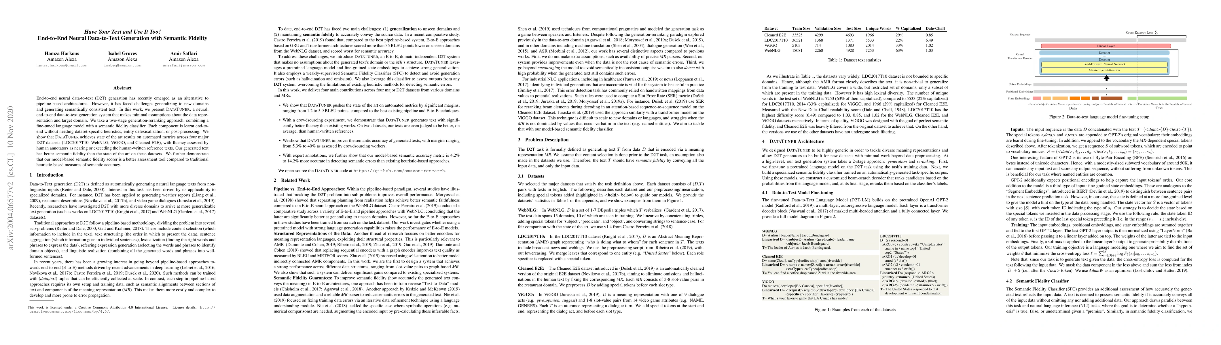 This paper introduces DataTuner, an end-to-end neural data-to-text generation system that achieves state-of-the-art results without dataset-specific heuristics. It combines a fine-tuned language model with a semantic fidelity classifier, demonstrating superior semantic consistency and fluency across multiple datasets.
