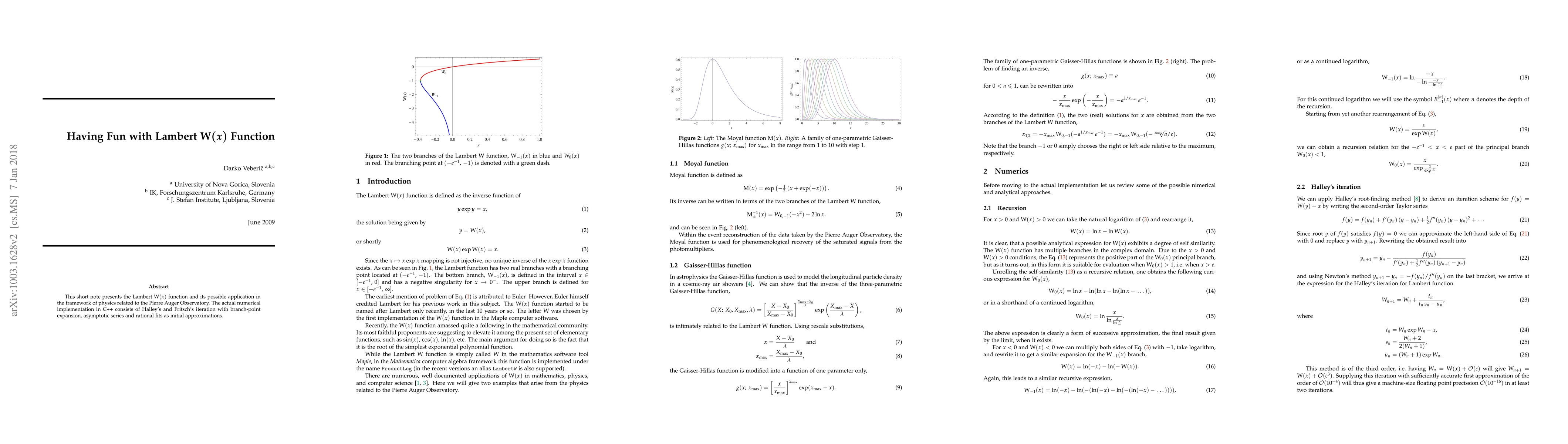 Summary: This paper introduces the Lambert W(x) function and explores its application in physics, particularly in the context of the Pierre Auger Observatory. It discusses numerical methods for implementation, including Halley's and Fritsch's iteration, branch-point expansion, and rational fits.