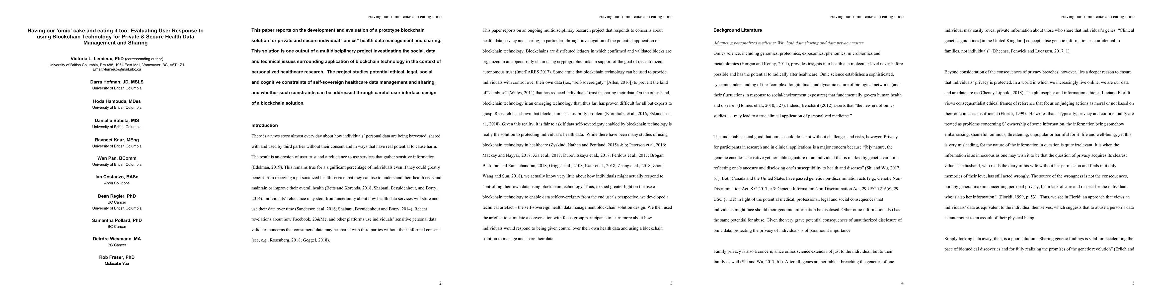 This paper reports on the development and evaluation of a prototype blockchain solution for private and secure individual omics health data management and sharing. This solution is one output of a multidisciplinary project investigating the social, data and technical issues surrounding application of blockchain technology in the context of personalized healthcare research. The project studies potential ethical, legal, social and cognitive constraints of self-sovereign healthcare data management and sharing, and whether such constraints can be addressed through careful user interface design of a blockchain solution.