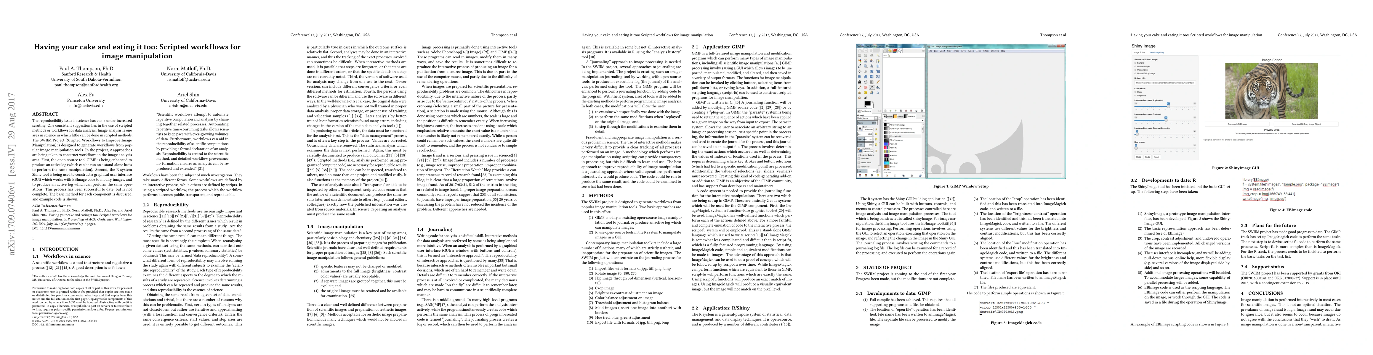 The reproducibility issue in science has come under increased scrutiny. One consistent suggestion lies in the use of scripted methods or workflows for data analysis. Image analysis is one area in science in which little can be done in scripted methods. The SWIIM Project (Scripted Workflows to Improve Image Manipulation) is designed to generate workflows from popular image manipulation tools. In the project, 2 approaches are being taken to construct workflows in the image analysis area. First, the open-source tool GIMP is being enhanced to produce an active log (which can be run on a stand-alone basis to perform the same manipulation). Second, the R system Shiny tool is being used to construct a graphical user interface (GUI) which works with EBImage code to modify images, and to produce an active log which can perform the same operations. This process has been successful to date, but is not complete. The basic method for each component is discussed, and example code is shown.