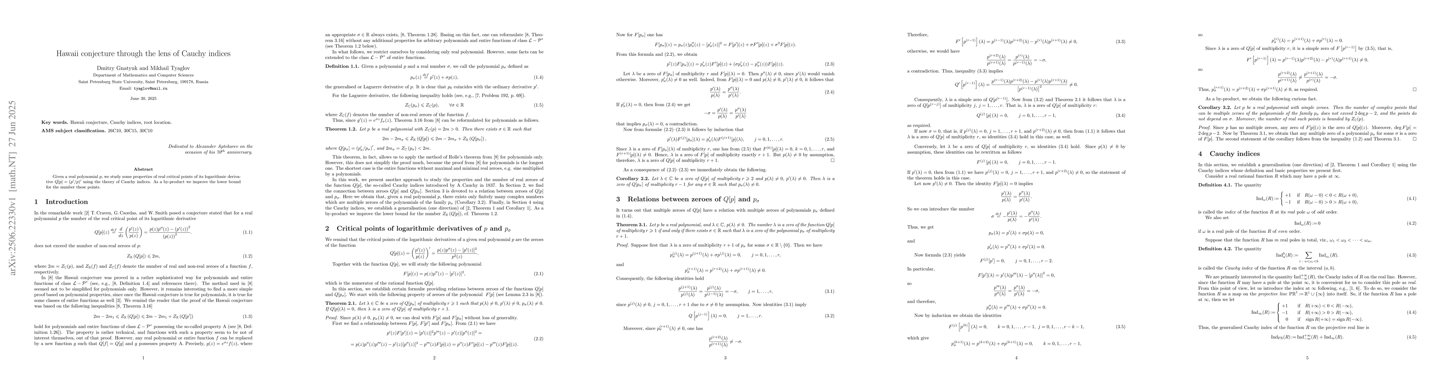 Given a real polynomial $p$, we study some properties of real critical points of its logarithmic derivative $Q[p]=(p'/p)'$ using the theory of Cauchy indices. As a by-product we improve the lower bound for the number these points.