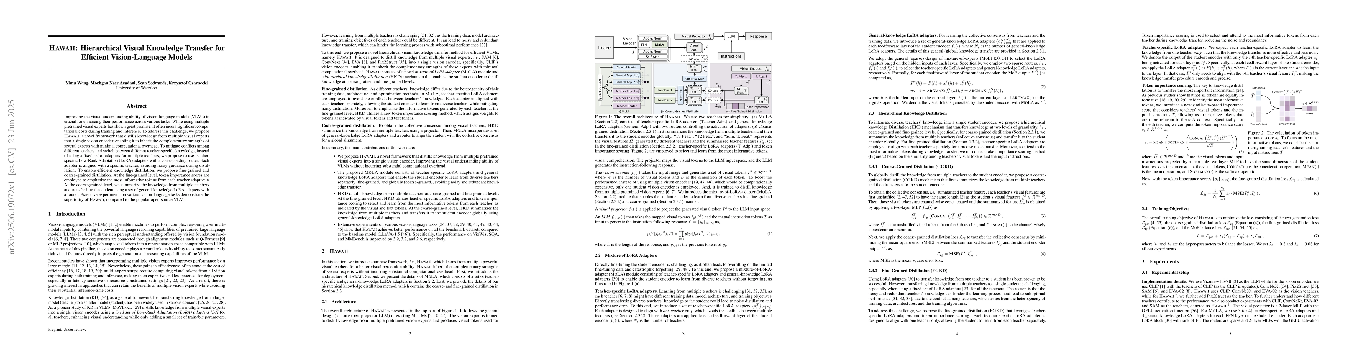 Improving the visual understanding ability of vision-language models (VLMs) is crucial for enhancing their performance across various tasks. While using multiple pretrained visual experts has shown great promise, it often incurs significant computational costs during training and inference. To address this challenge, we propose HAWAII, a novel framework that distills knowledge from multiple visual experts into a single vision encoder, enabling it to inherit the complementary strengths of several experts with minimal computational overhead. To mitigate conflicts among different teachers and switch between different teacher-specific knowledge, instead of using a fixed set of adapters for multiple teachers, we propose to use teacher-specific Low-Rank Adaptation (LoRA) adapters with a corresponding router. Each adapter is aligned with a specific teacher, avoiding noisy guidance during distillation. To enable efficient knowledge distillation, we propose fine-grained and coarse-grained distillation. At the fine-grained level, token importance scores are employed to emphasize the most informative tokens from each teacher adaptively. At the coarse-grained level, we summarize the knowledge from multiple teachers and transfer it to the student using a set of general-knowledge LoRA adapters with a router. Extensive experiments on various vision-language tasks demonstrate the superiority of HAWAII, compared to the popular open-source VLMs.