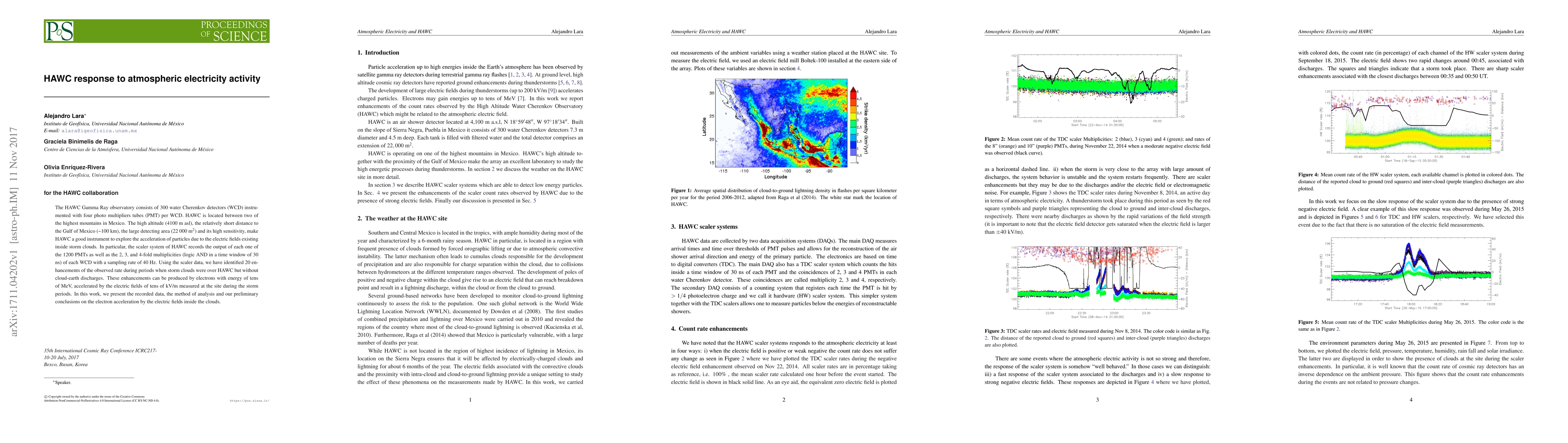 The HAWC Gamma Ray observatory consists of 300 water Cherenkov detectors (WCD) instrumented with four photo multipliers tubes (PMT) per WCD. HAWC is located between two of the highest mountains in Mexico. The high altitude (4100 m asl), the relatively short distance to the Gulf of Mexico (~100 km), the large detecting area (22 000 m$^2$) and its high sensitivity, make HAWC a good instrument to explore the acceleration of particles due to the electric fields existing inside storm clouds. In particular, the scaler system of HAWC records the output of each one of the 1200 PMTs as well as the 2, 3, and 4-fold multiplicities (logic AND in a time window of 30 ns) of each WCD with a sampling rate of 40 Hz. Using the scaler data, we have identified 20 enhancements of the observed rate during periods when storm clouds were over HAWC but without cloud-earth discharges. These enhancements can be produced by electrons with energy of tens of MeV, accelerated by the electric fields of tens of kV/m measured at the site during the storm periods. In this work, we present the recorded data, the method of analysis and our preliminary conclusions on the electron acceleration by the electric fields inside the clouds.