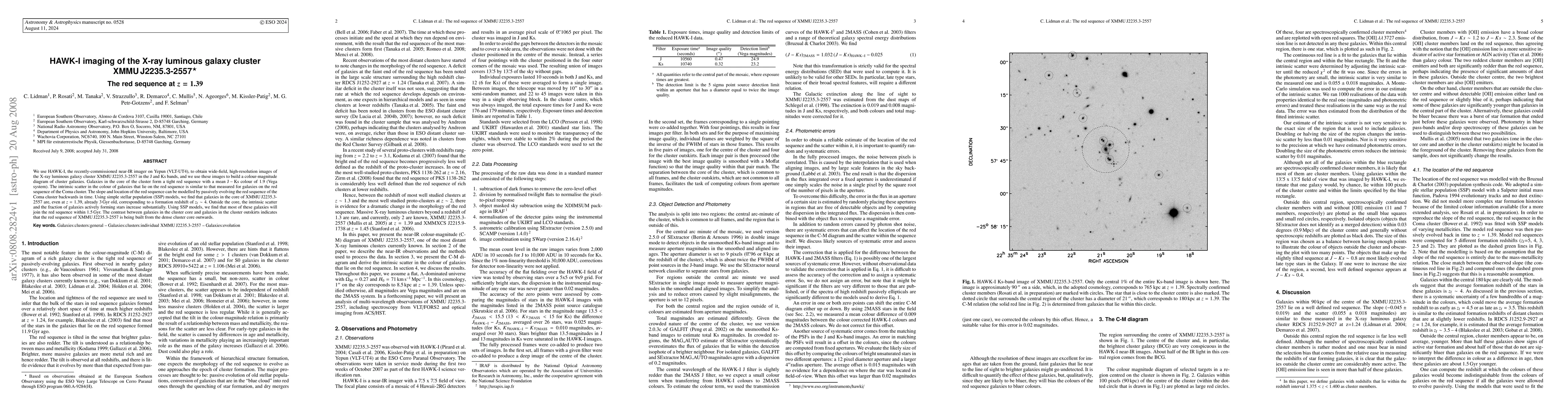 This paper uses HAWK-I imaging to study the galaxy cluster XMMU J2235.3-2557 at z=1.39, finding that core galaxies form a red sequence indicative of old, passively evolving stars. Galaxies outside the core show more star formation and will join the red sequence within 1.5 Gyr, suggesting the red sequence is expanding from the cluster core outwards.