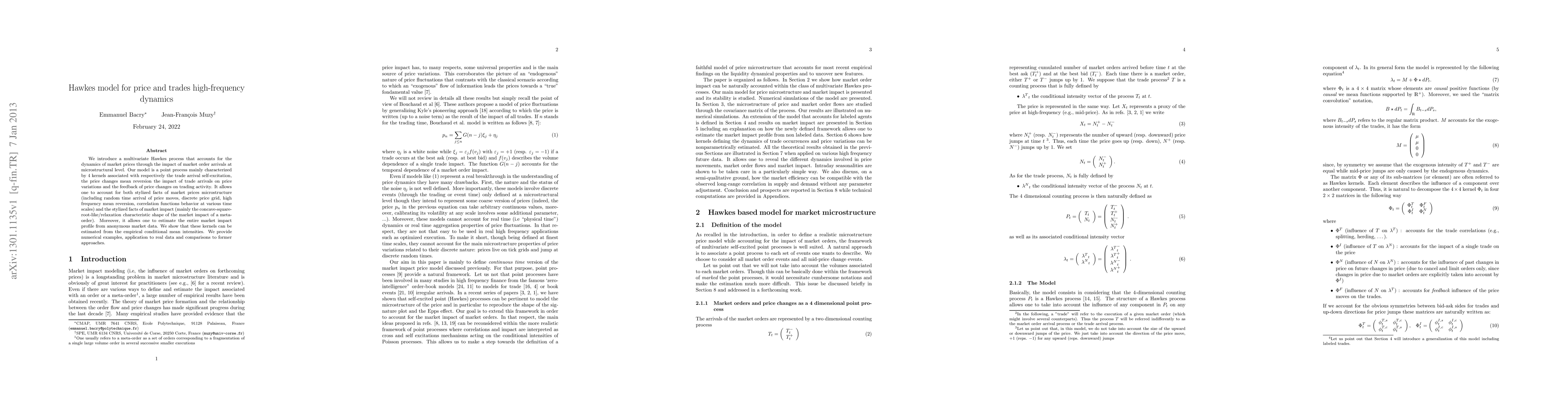 This paper introduces a multivariate Hawkes process to model the dynamics of market prices and trade arrivals, characterized by four kernels capturing self-excitation, mean reversion, and feedback effects. The model estimates market impact profiles from anonymous market data and compares its performance to previous methods.