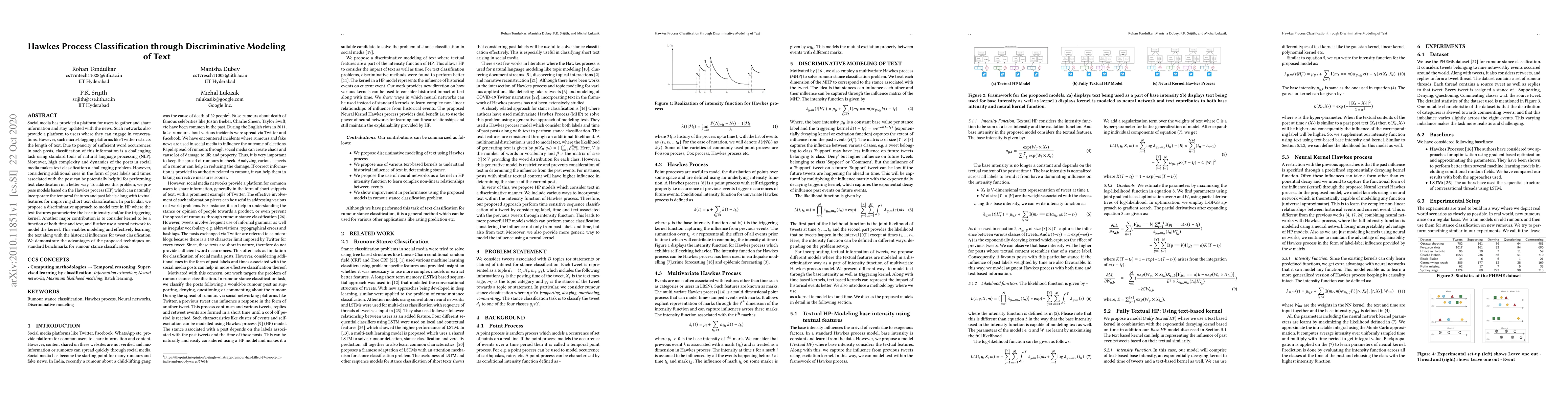 Social media has provided a platform for users to gather and share information and stay updated with the news. Such networks also provide a platform to users where they can engage in conversations. However, such micro-blogging platforms like Twitter restricts the length of text. Due to paucity of sufficient word occurrences in such posts, classification of this information is a challenging task using standard tools of natural language processing (NLP). Moreover, high complexity and dynamics of the posts in social media makes text classification a challenging problem. However, considering additional cues in the form of past labels and times associated with the post can be potentially helpful for performing text classification in a better way. To address this problem, we propose models based on the Hawkes process (HP) which can naturally incorporate the temporal features and past labels along with textual features for improving short text classification. In particular, we propose a discriminative approach to model text in HP where the text features parameterize the base intensity and/or the triggering kernel. Another major contribution is to consider kernel to be a function of both time and text, and further use a neural network to model the kernel. This enables modelling and effectively learning the text along with the historical influences for tweet classification. We demonstrate the advantages of the proposed techniques on standard benchmarks for rumour stance classification.