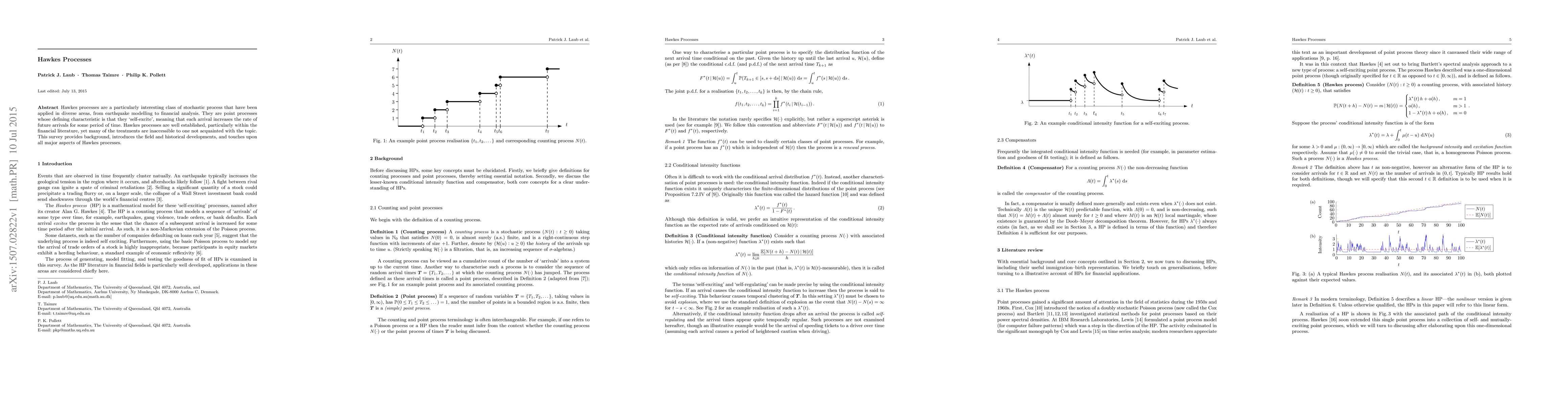 This paper surveys Hawkes processes, a class of self-exciting stochastic point processes used in various fields like earthquake modeling and finance. It provides an accessible introduction to the topic, covering historical developments and major aspects.