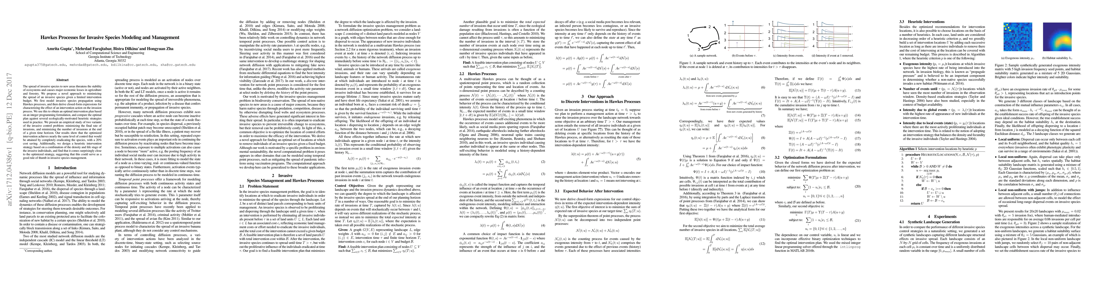 This paper proposes a novel use of Hawkes processes to model and manage the spread of invasive species, developing an optimal intervention plan that minimizes spread while saving 20% on costs compared to complete eradication. It also introduces a heuristic strategy based on invasive individual density and life stage that performs nearly as well as the optimal plan.