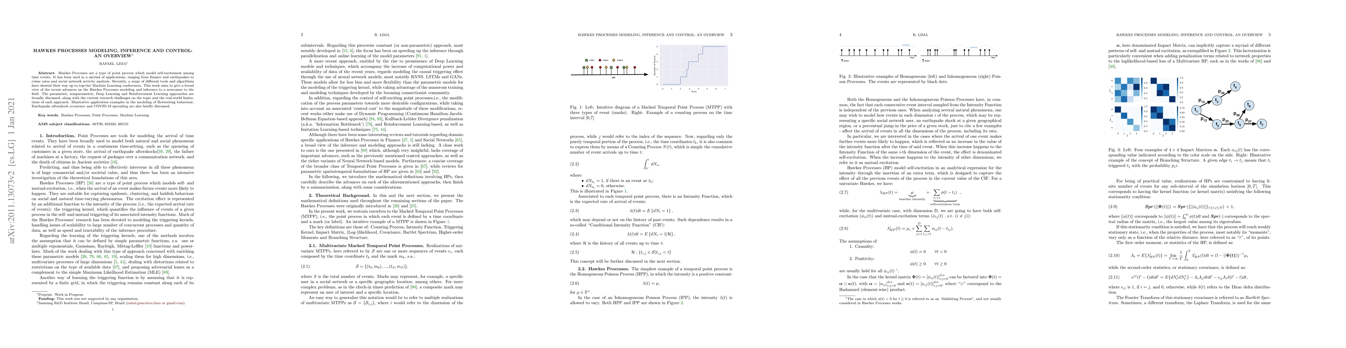 Summary: This paper provides an accessible overview of recent advances in modeling, inference, and control of Hawkes Processes, which are point processes used to model self-excited time events, and highlights their applications across various domains. It aims to introduce newcomers to the field to the latest tools and algorithms.