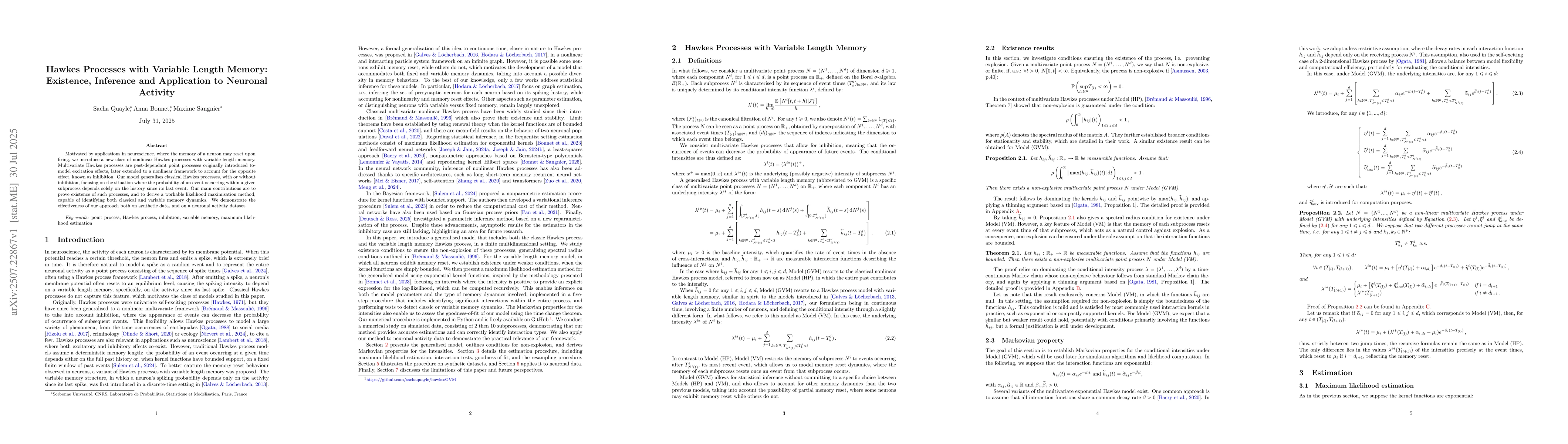 The paper introduces a generalized model for nonlinear Hawkes processes with variable length memory in a finite multi-dimensional setting, proving existence and deriving a likelihood maximization method for parameter estimation and distinguishing between classical and variable memory dynamics.