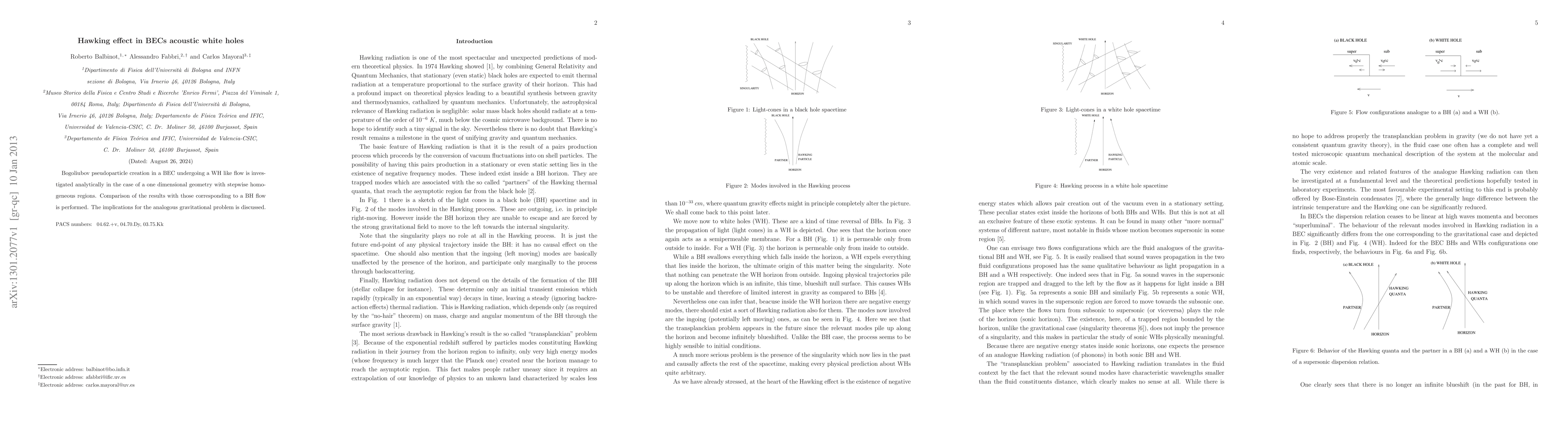 Bogoliubov pseudoparticle creation in a BEC undergoing a WH like flow is investigated analytically in the case of a one dimensional geometry with stepwise homogeneous regions. Comparison of the results with those corresponding to a BH flow is performed. The implications for the analogous gravitational problem is discussed.