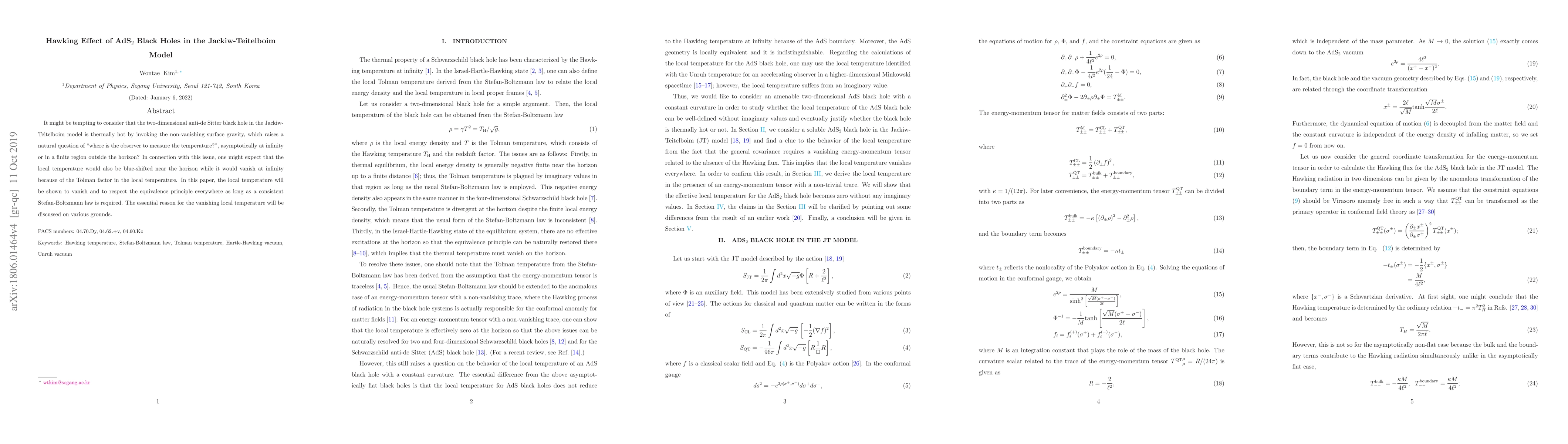 It might be tempting to consider that the two-dimensional anti-de Sitter black hole in the Jackiw-Teitelboim model is thermally hot by invoking the non-vanishing surface gravity. So, one might expect that the local temperature would also be blue-shifted near the horizon, while it would vanish at infinity because of the Tolman factor of the local temperature. In this paper, we will show that the local temperature vanishes everywhere, which respects the equivalence principle perfectly in contrast to the case of the asymptotically flat black holes recovering the equivalence principle just at the horizon. In other words, the origin of radiation for a fixed observer comes from the Unruh effect rather than the Hawking effect. If the inward and outward fluxes are defined non-trivially at the horizon, then the local temperature of the black hole takes the usual Tolman form; however, the divergent Tolman temperature at the horizon is incompatible with the finite local energy density there.