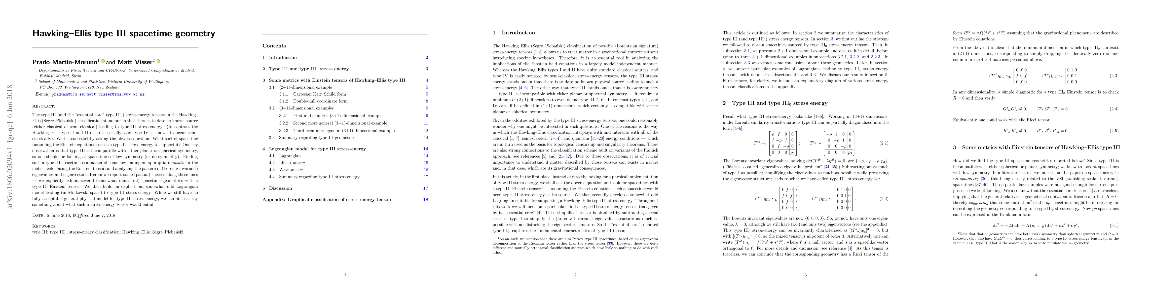 The type III (and the "essential core" type III$_0$) stress-energy tensors in the Hawking-Ellis (Segre-Plebanski) classification stand out in that there is to date no known source (either classical or semi-classical) leading to type III stress-energy. (In contrast the Hawking-Ells types I and II occur classically, and type IV is known to occur semi-classically). We instead start by asking the obverse question: What sort of spacetime (assuming the Einstein equations) needs a type III stress-energy to support it? One key observation is that type III is incompatible with either planar or spherical symmetry, so one should be looking at spacetimes of low symmetry (or no symmetry). Finding such a type III spacetime is a matter of somehow finding an appropriate ansatz for the metric, calculating the Einstein tensor, and analyzing the pattern of (Lorentz invariant) eigenvalues and eigenvectors. Herein we report some (partial) success along these lines - we explicitly exhibit several (somewhat unnatural) spacetime geometries with a type III Einstein tensor. We then build an explicit but somewhat odd Lagrangian model leading (in Minkowski space) to type III stress-energy. While we still have no fully acceptable general physical model for type III stress-energy, we can at least say something about what such a stress-energy tensor would entail.