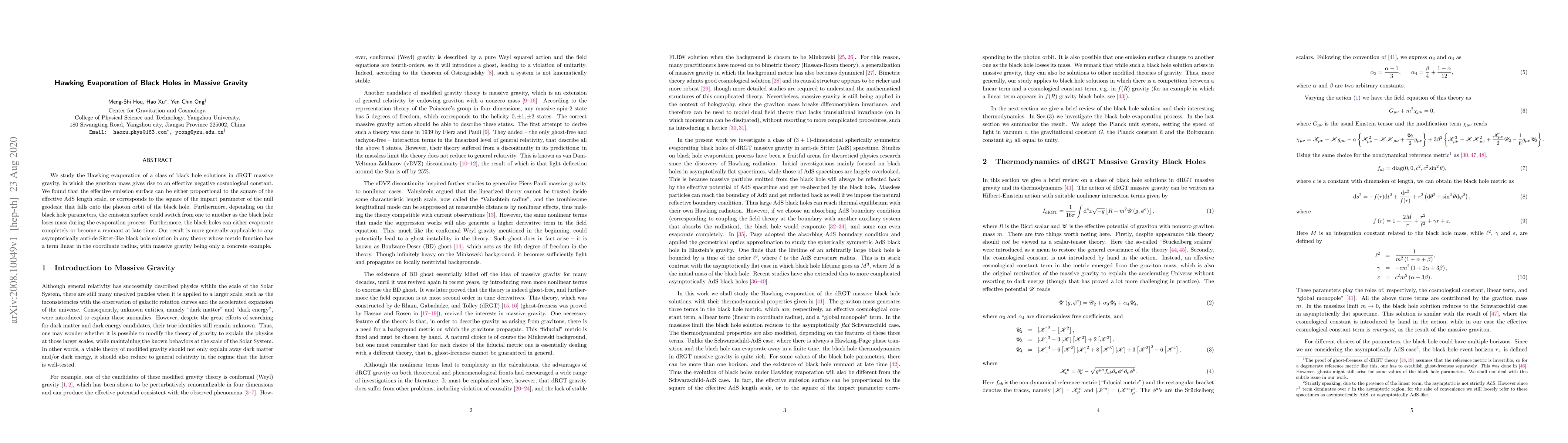 This paper investigates the Hawking evaporation process in dRGT massive gravity, revealing that the emission surface can vary based on the black hole's mass and parameters, potentially switching between two forms as the black hole evaporates. The findings apply broadly to any asymptotically anti-de Sitter-like black hole solutions.