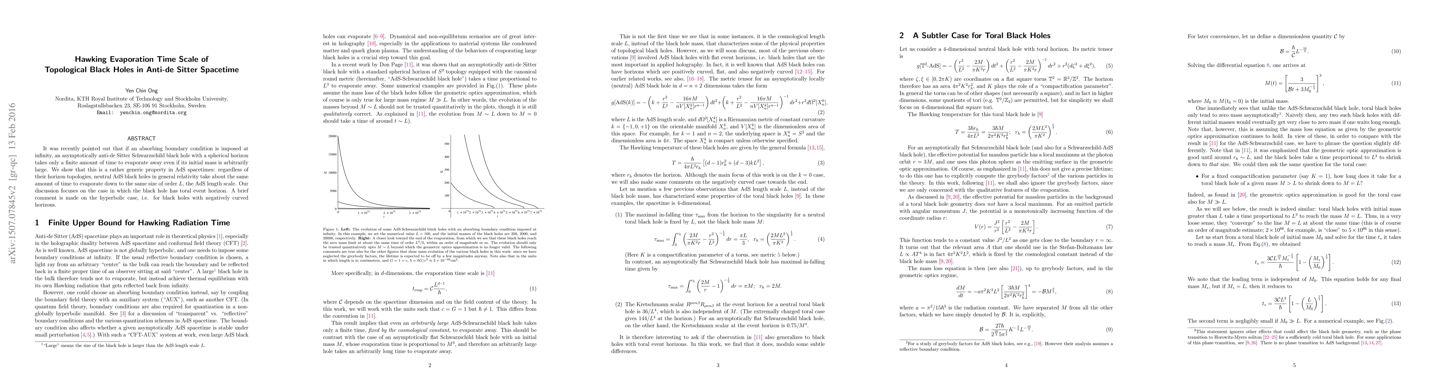 Topological black holes in anti-de Sitter spacetime evaporate at a similar time scale, regardless of horizon topology, with an evaporation time of approximately L, the AdS length scale.