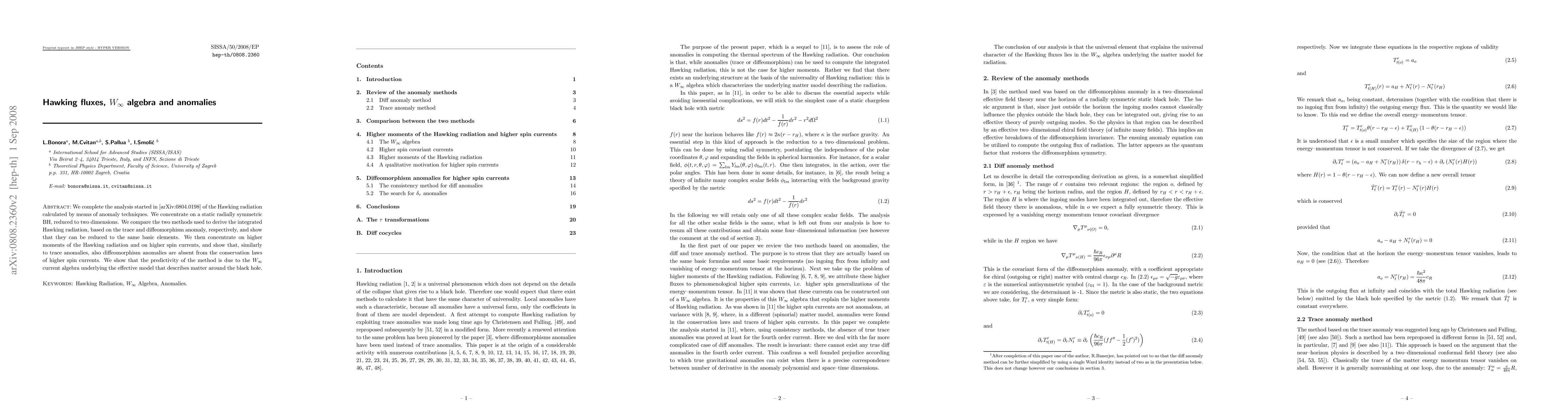 We complete the analysis started in [arXiv:0804.0198] of the Hawking radiation calculated by means of anomaly techniques. We concentrate on a static radially symmetric BH, reduced to two dimensions. We compare the two methods used to derive the integrated Hawking radiation, based on the trace and diffeomorphism anomaly, respectively, and show that they can be reduced to the same basic elements. We then concentrate on higher moments of the Hawking radiation and on higher spin currents, and show that, similarly to trace anomalies, also diffeomorphism anomalies are absent from the conservation laws of higher spin currents. We show that the predictivity of the method is due to the $W_\infty$ current algebra underlying the effective model that describes matter around the black hole.