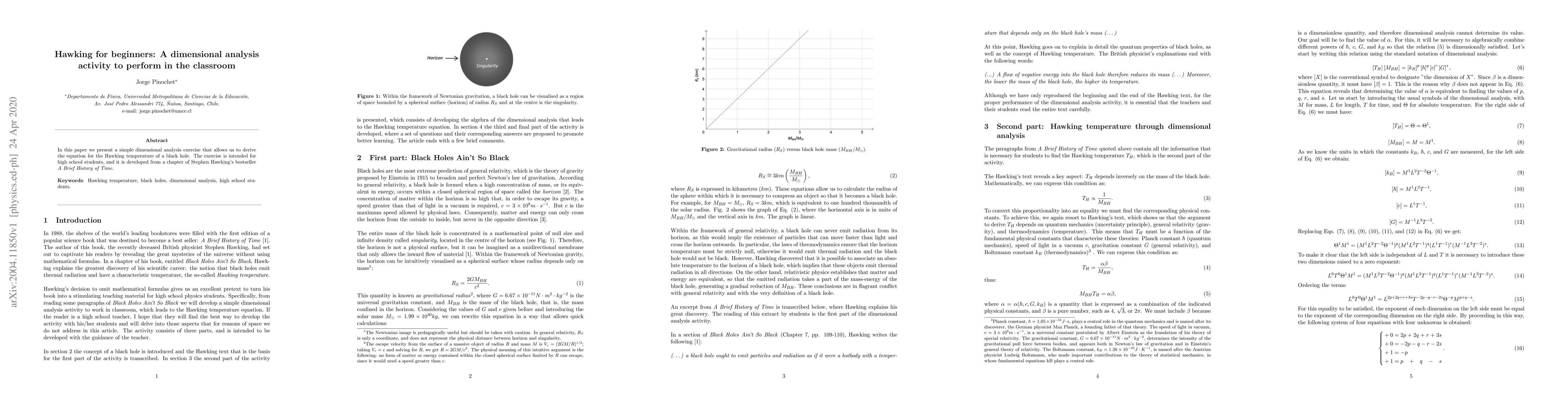 In this paper we present a simple dimensional analysis exercise that allows us to derive the equation for the Hawking temperature of a black hole. The exercise is intended for high school students, and it is developed from a chapter of Stephen Hawking's bestseller A Brief History of Time.