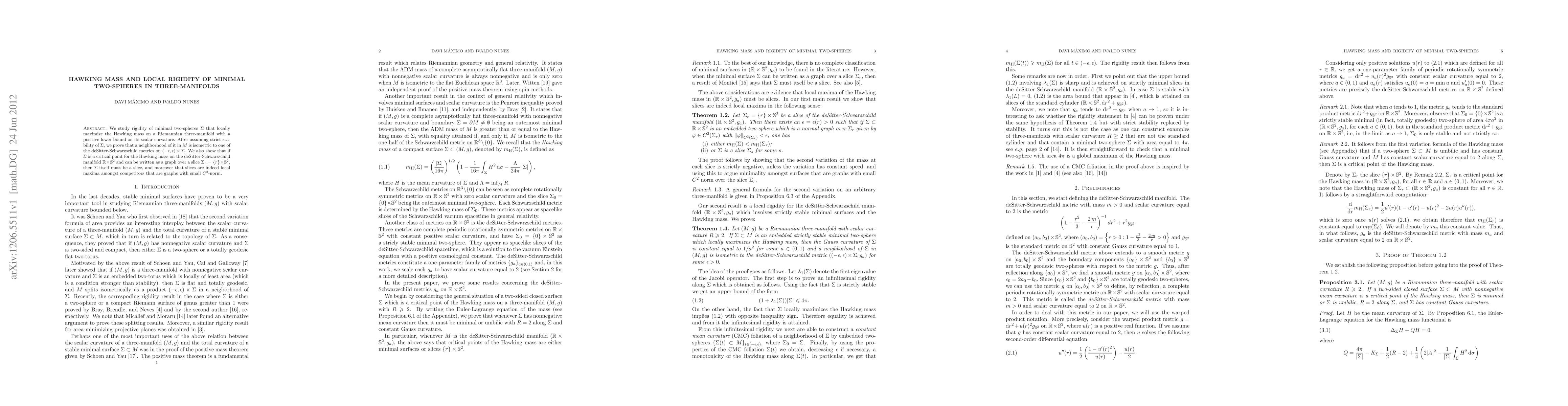 We study rigidity of minimal two-spheres $\Sigma$ that locally maximize the Hawking mass on a Riemannian three-manifold with a positive lower bound on its scalar curvature. After assuming strict stability of $\Sigma$, we prove that a neighborhood of it in $M$ is isometric to one of the deSitter-Schwarzschild metrics on $(- \epsilon,\epsilon)\times \Sigma$. We also show that if $\Sigma$ is a critical point for the Hawking mass on the deSitter-Schwarzschild manifold $\mathbb{R}\times\Sph^2$ and can be written as a graph over a slice $\Sigma_r=\{r\}\times\mathbb{S}^2$, then $\Sigma$ itself must be a slice, and moreover that slices are indeed local maxima amongst competitors that are graphs with small $C^2$-norm.