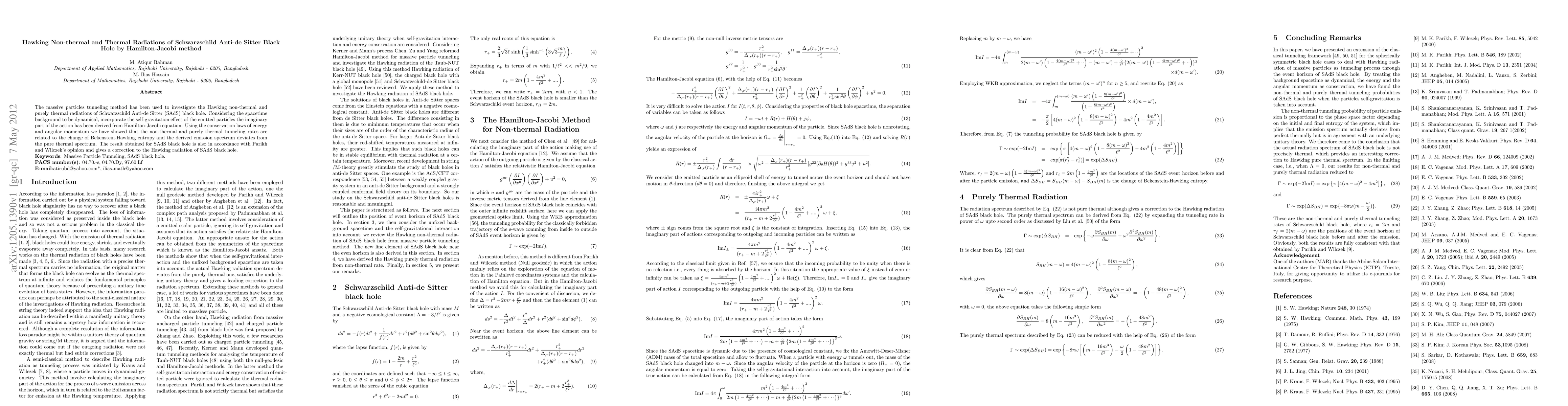 This paper investigates the Hawking radiation of a Schwarzschild Anti-de Sitter black hole using the massive particles tunneling method and the Hamilton-Jacobi equation, showing that the emission spectrum deviates from a pure thermal spectrum and provides a correction to the traditional Hawking radiation model. The study aligns with Parikh and Wilczek's views on non-thermal radiation and relates tunneling rates to changes in Bekenstein-Hawking entropy.