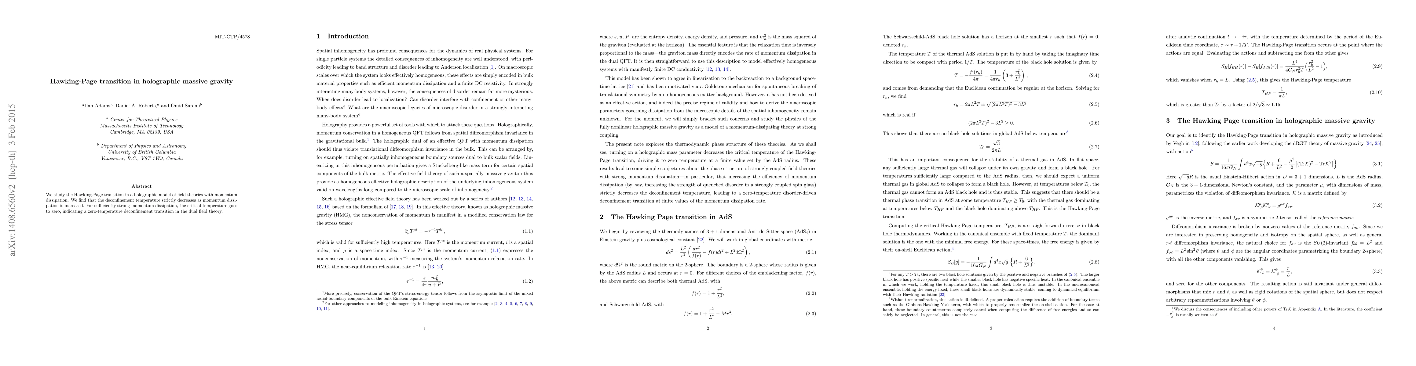 The research investigates the Hawking-Page transition in a holographic model with momentum dissipation, finding that increased dissipation lowers the deconfinement temperature and leads to a zero-temperature transition at strong dissipation.
