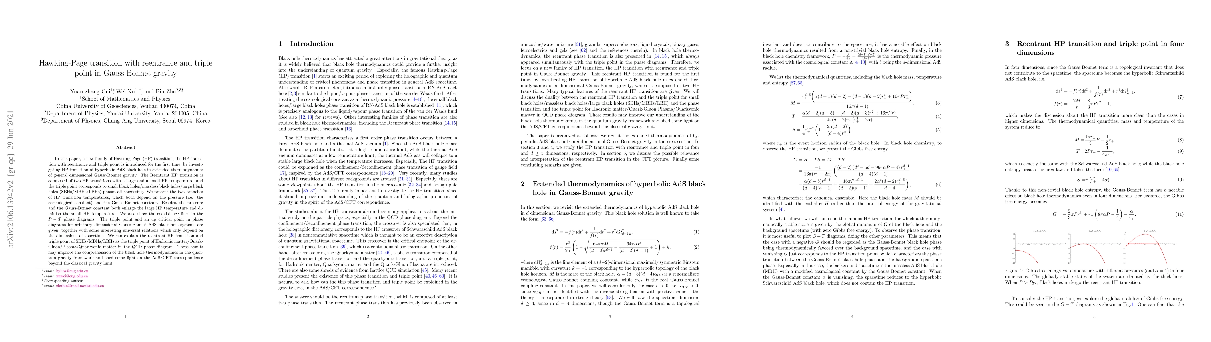This paper introduces a novel Hawking-Page transition with reentrance and triple point in Gauss-Bonnet gravity, analyzing hyperbolic AdS black holes. It presents two branches of transition temperatures dependent on pressure and the Gauss-Bonnet constant, and discusses the implications for understanding black hole thermodynamics and the AdS/CFT correspondence.