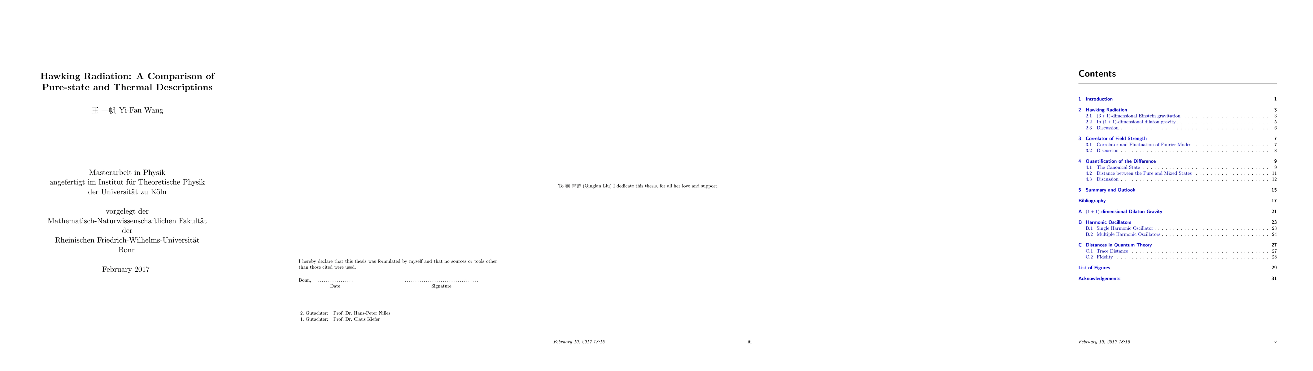The cases of the Hawking radiation field being described by a pure state and by the usual thermal state are compared within the CGHS dilaton gravity model. The field-strength fluctuations of the Fourier modes are computed, showing a discrepancy in the low-energy regime, while coinciding at high energies. Then by defining a distance for density operators and evaluating it for the cases concerned, the difference between the pure and thermal descriptions is quantified and found to be exponentially small with respect to the Hawking temperature. Possible physical interpretations are discussed.