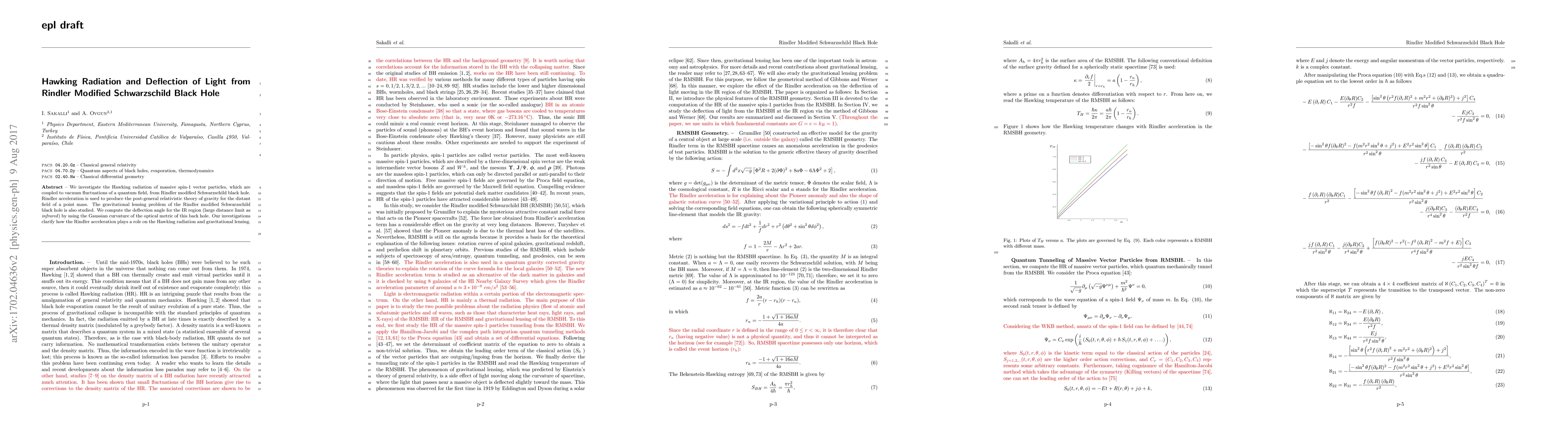 We investigate the Hawking radiation of massive spin-1 vector particles, which are coupled to vacuum fluctuations of a quantum field, from Rindler modified Schwarzschild black hole. Rindler acceleration is used to produce the post-general relativistic theory of gravity for the distant field of a point mass. The gravitational lensing problem of the Rindler modified Schwarzschild black hole is also studied. We compute the deflection angle for the IR region (large distance limit as infrared) by using the Gaussian curvature of the optical metric of this back hole. Our investigations clarify how the Rindler acceleration plays a role on the Hawking radiation and gravitational lensing.