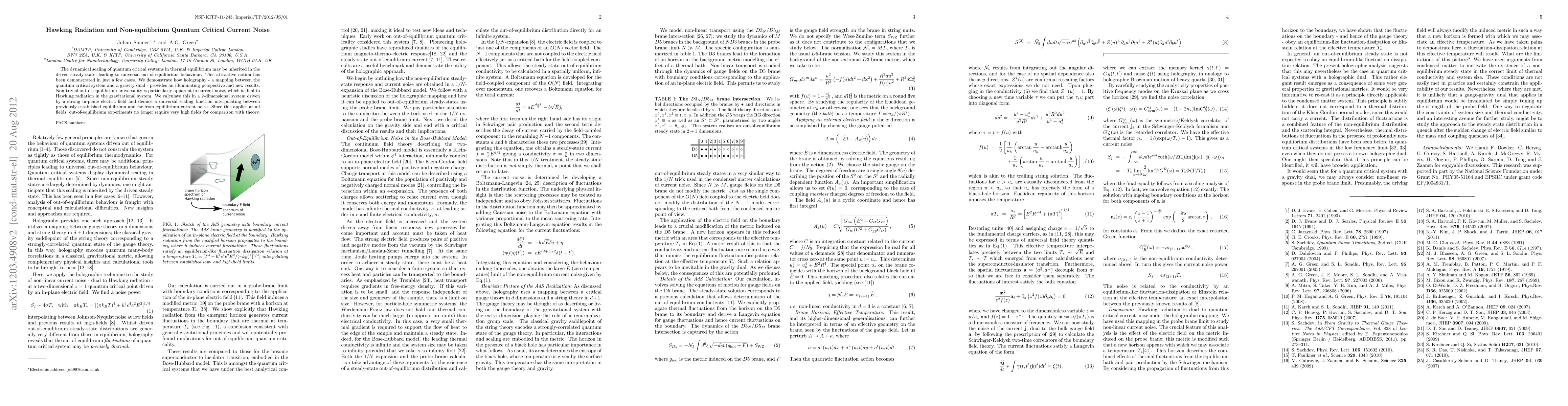 The dynamical scaling of quantum critical systems in thermal equilibrium may be inherited in the driven steady-state, leading to universal out-of-equilibrium behaviour. This attractive notion has been demonstrated in just a few cases. We demonstrate how holography - a mapping between the quantum critical system and a gravity dual - provides an illuminating perspective and new results. Non-trivial out-of-equilibrium universality is particularly apparent in current noise, which is dual to Hawking radiation in the gravitational system. We calculate this in a 2-dimensional system driven by a strong in-plane electric field and deduce a universal scaling function interpolating between previously established equilibrium and far-from-equilibrium current noise. Since this applies at all fields, out-of-equilibrium experiments no longer require very high fields for comparison with theory.