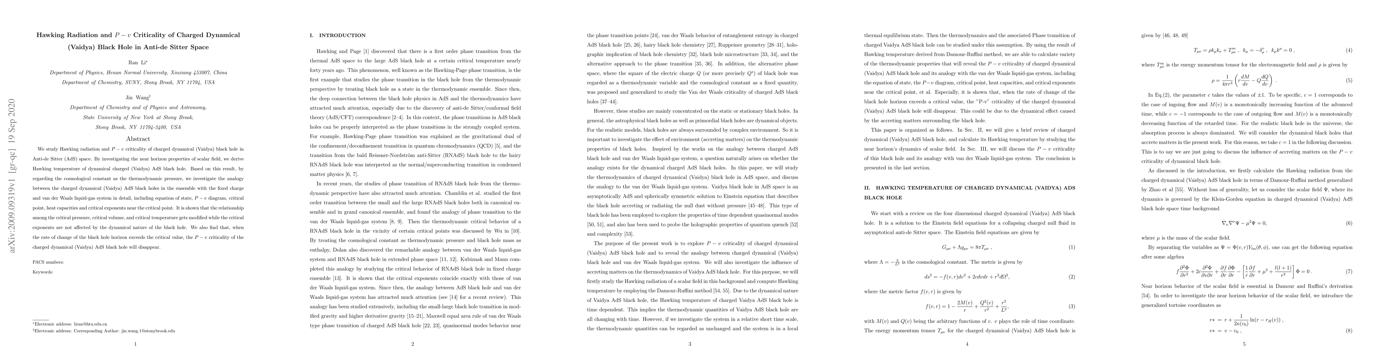 This research explores Hawking radiation and $P-v$ criticality in charged dynamical Vaidya black holes within Anti-de Sitter space, showing that their thermodynamic properties resemble those of van der Waals fluids, with modified critical pressure and volume but unchanged critical exponents. It concludes that exceeding a critical horizon change rate eliminates $P-v$ criticality.