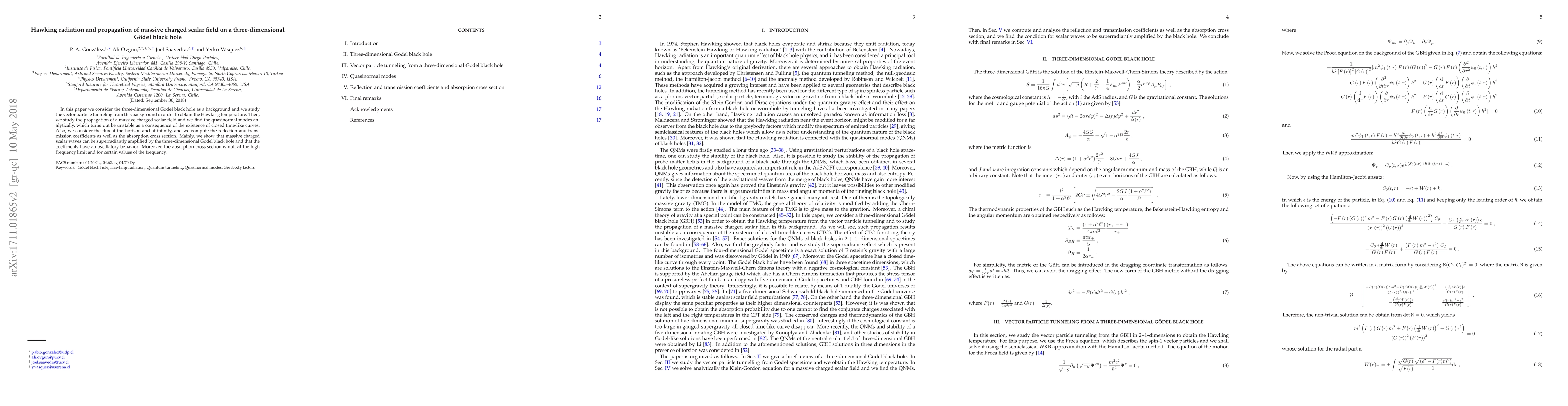 In this paper we consider the three-dimensional G\"{o}del black hole as a background and we study the vector particle tunneling from this background in order to obtain the Hawking temperature. Then, we study the propagation of a massive charged scalar field and we find the quasinormal modes analytically, which turns out be unstable as a consequence of the existence of closed time-like curves. Also, we consider the flux at the horizon and at infinity, and we compute the reflection and transmission coefficients as well as the absorption cross section. Mainly, we show that massive charged scalar waves can be superradiantly amplified by the three-dimensional G\"{o}del black hole and that the coefficients have an oscillatory behavior. Moreover, the absorption cross section is null at the high frequency limit and for certain values of the frequency.