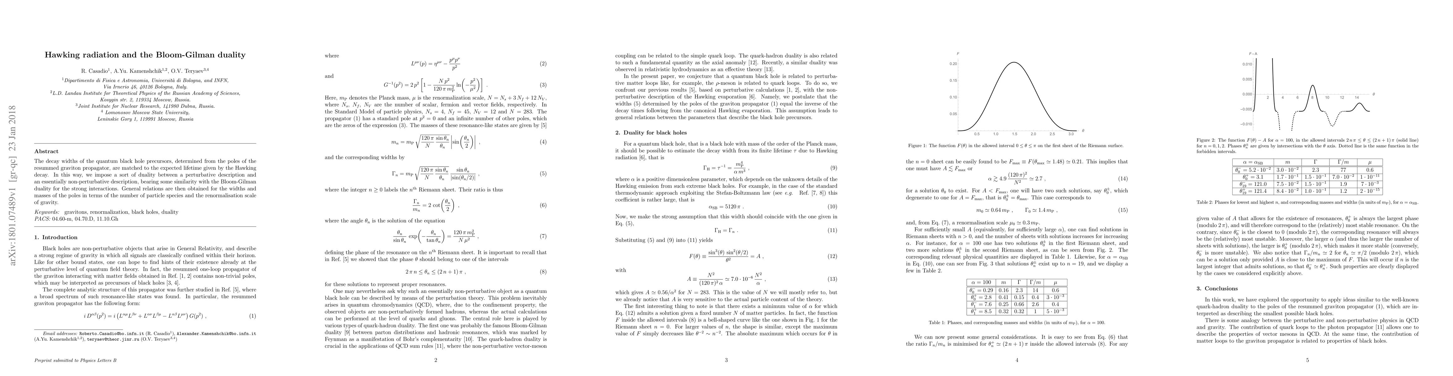 The decay widths of the quantum black hole precursors, determined from the poles of the resummed graviton propagator, are matched to the expected lifetime given by the Hawking decay. In this way, we impose a sort of duality between a perturbative description and an essentially non-perturbative description, bearing some similarity with the Bloom-Gilman duality for the strong interactions. General relations are then obtained for the widths and masses of the poles in terms of the number of particle species and the renormalisation scale of gravity.