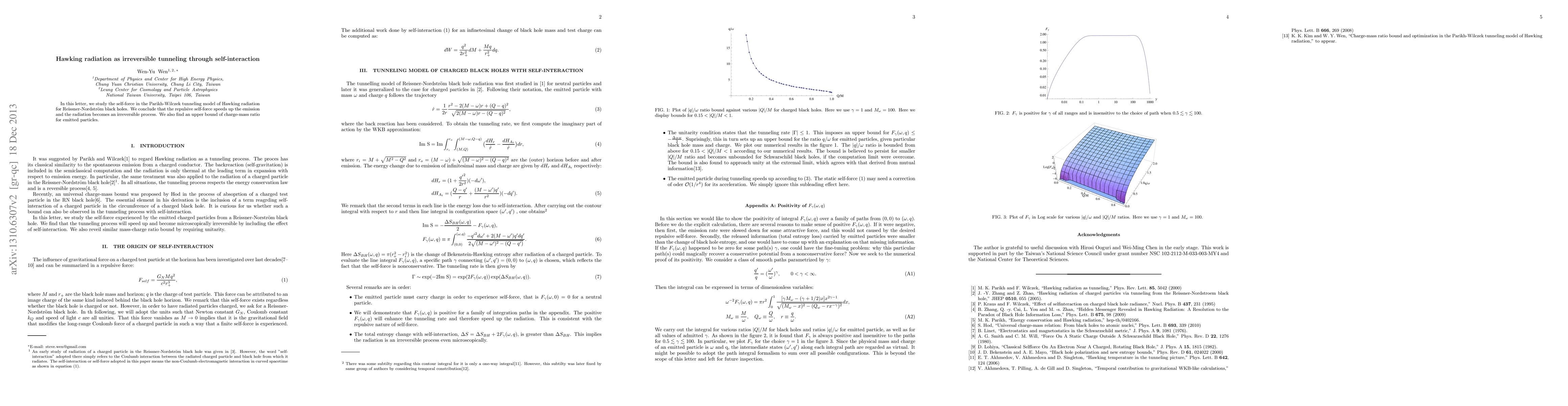 This paper investigates the self-force in the Parikh-Wilczek tunneling model for Hawking radiation in Reissner-Nordström black holes, concluding that the repulsive self-force accelerates the emission, rendering the radiation process irreversible. It also determines an upper limit for the charge-mass ratio of emitted particles.