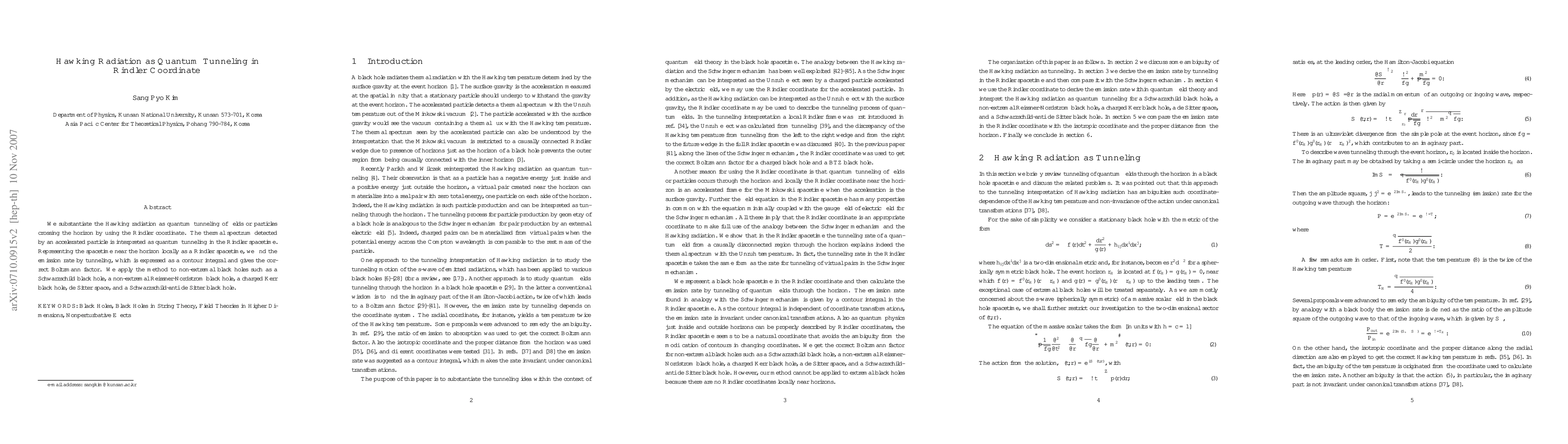This paper demonstrates that Hawking radiation can be understood as quantum tunneling through the horizon using Rindler coordinates, showing a thermal spectrum via tunneling in Rindler spacetime. The study calculates the emission rate via tunneling and applies this method to various types of non-extremal black holes.