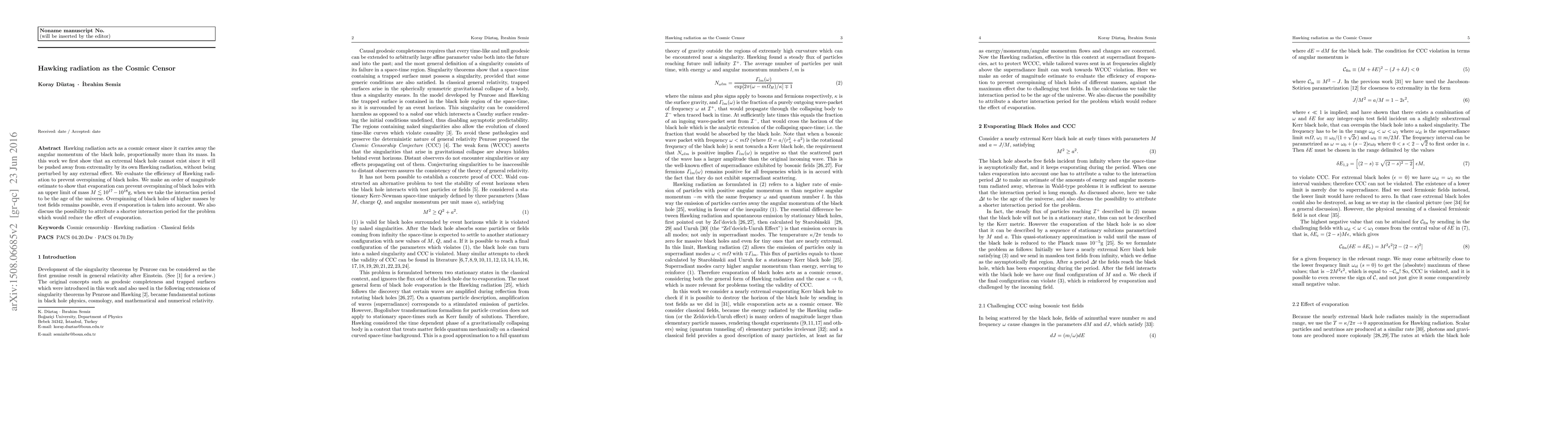 This paper demonstrates that Hawking radiation prevents black holes from becoming extremal by carrying away angular momentum, thus acting as a cosmic censor. It estimates that black hole evaporation can prevent overspinning for masses up to $M\lesssim 10^{17}-10^{18}\rm{g}$ over the age of the universe, but higher mass black holes may still be overspun by test fields.