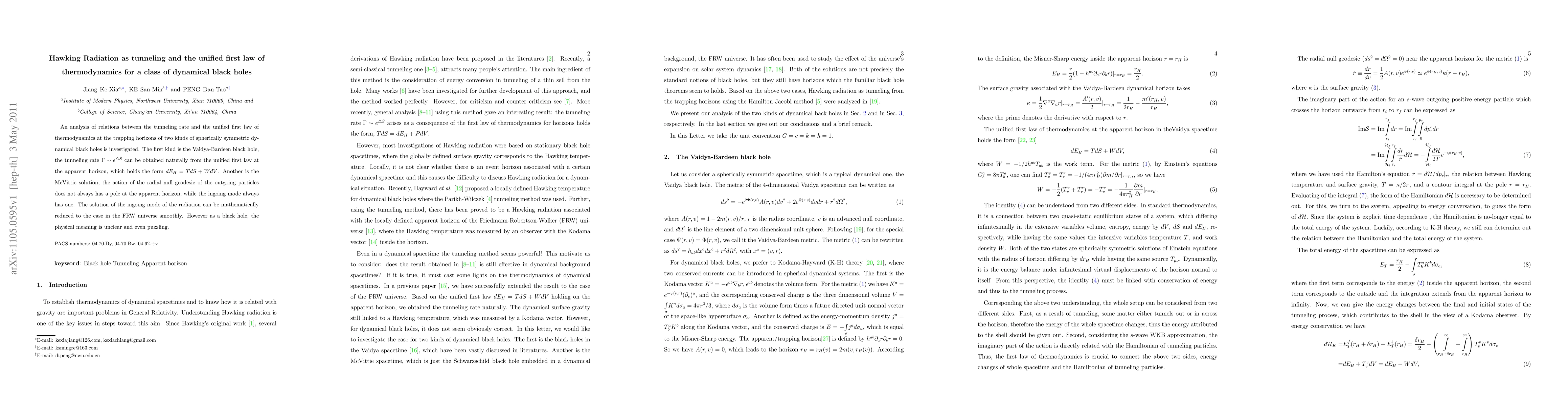 This paper explores the connection between Hawking radiation tunneling and the unified first law of thermodynamics for two types of dynamical black holes: the Vaidya-Bardeen and McVittie solutions. The tunneling rate for the former is derived from the unified first law at the apparent horizon, while the latter presents a puzzling ingoing radiation mode.