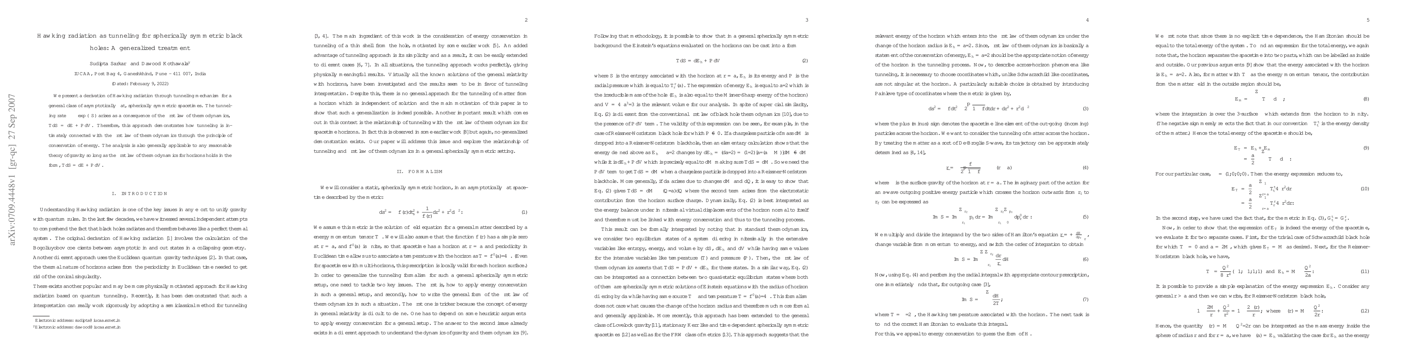 We present a derivation of Hawking radiation through tunneling mechanism for a general class of asymptotically flat, spherically symmetric spacetimes. The tunneling rate $\Gamma \sim \exp{(\Delta S)}$ arises as a consequence of the first law of thermodynamics, TdS=dE + PdV. Therefore, this approach demonstrates how tunneling is intimately connected with the first law of thermodynamics through the principle of conservation of energy. The analysis is also generally applicable to any reasonable theory of gravity so long as the first law of thermodynamics for horizons holds in the form, TdS=dE + PdV.