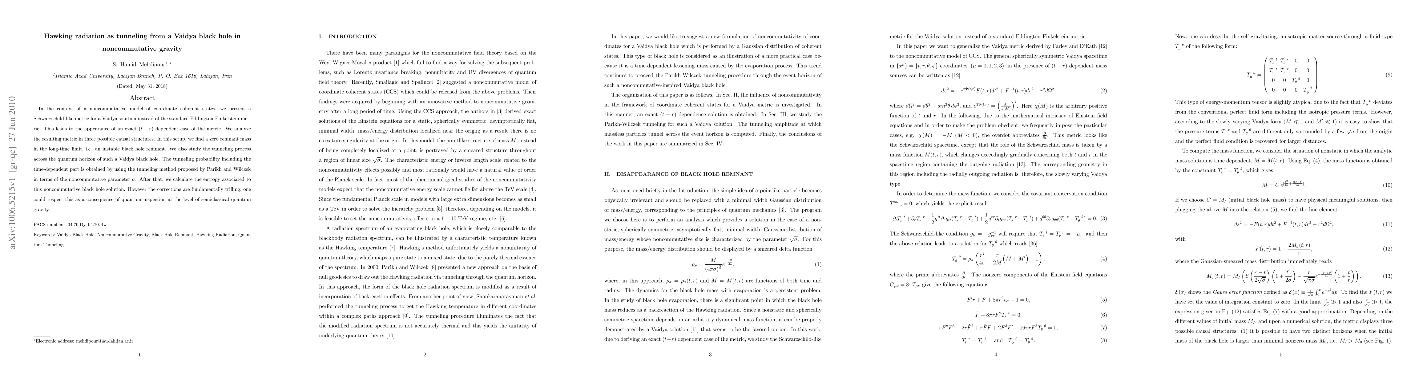 In the context of a noncommutative model of coordinate coherent states, we present a Schwarzschild-like metric for a Vaidya solution instead of the standard Eddington-Finkelstein metric. This leads to the appearance of an exact $(t - r)$ dependent case of the metric. We analyze the resulting metric in three possible causal structures. In this setup, we find a zero remnant mass in the long-time limit, i.e. an instable black hole remnant. We also study the tunneling process across the quantum horizon of such a Vaidya black hole. The tunneling probability including the time-dependent part is obtained by using the tunneling method proposed by Parikh and Wilczek in terms of the noncommutative parameter $\sigma$. After that, we calculate the entropy associated to this noncommutative black hole solution. However the corrections are fundamentally trifling; one could respect this as a consequence of quantum inspection at the level of semiclassical quantum gravity.