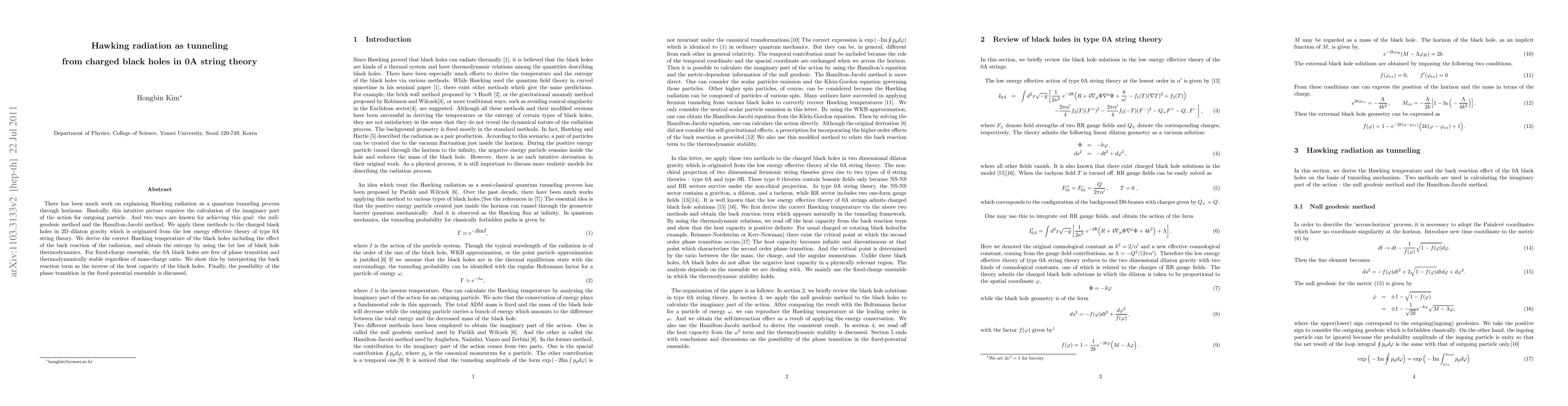 This paper investigates Hawking radiation from charged black holes within the context of 0A string theory, explaining it as a quantum tunneling phenomenon using the null-geodesic and Hamilton-Jacobi methods. It concludes that 0A black holes in a fixed-charge ensemble remain thermodynamically stable and avoid phase transitions.